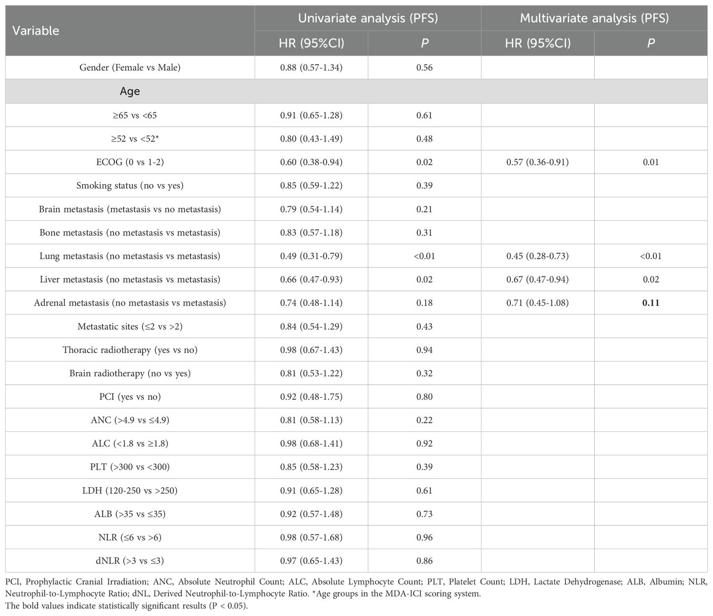 Table 2. Univariate and multivariate Cox regression analyses of clinicopathological characteristics associated with progression-free survival (PFS) in ES-SCLC patients receiving first-line chemoimmunotherapy.