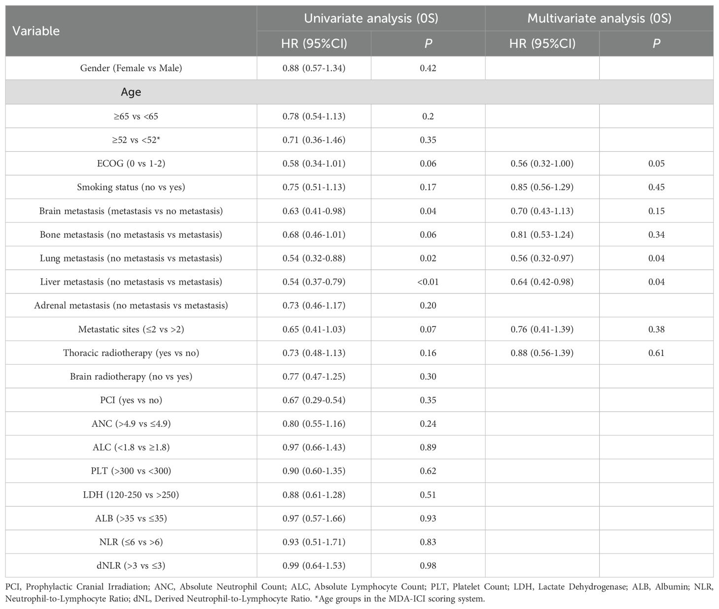 Table 3. Univariate and multivariate Cox regression analyses of clinicopathological characteristics associated with overall survival (OS) in ES-SCLC patients receiving first-line chemoimmunotherapy.