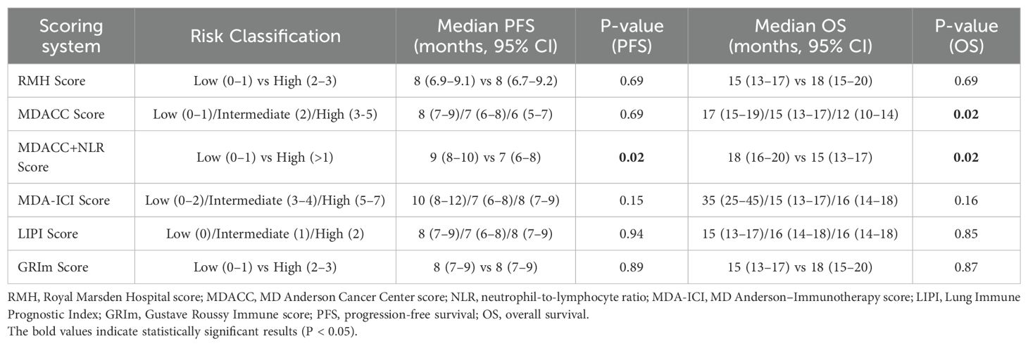 As shown in Table 4, the comparative analysis of six prognostic scoring systems revealed that only the MDACC+NLR composite score provided significant prognostic separation for both PFS and OS. The MDACC score showed moderate prognostic relevance for OS, whereas the RMH, MDA-ICI, LIPI, and GRIm models failed to demonstrate significant survival discrimination. These findings indicate that the MDACC+NLR model may serve as a practical and reliable prognostic tool for risk stratification in real-world ES-SCLC patients receiving chemoimmunotherapy.