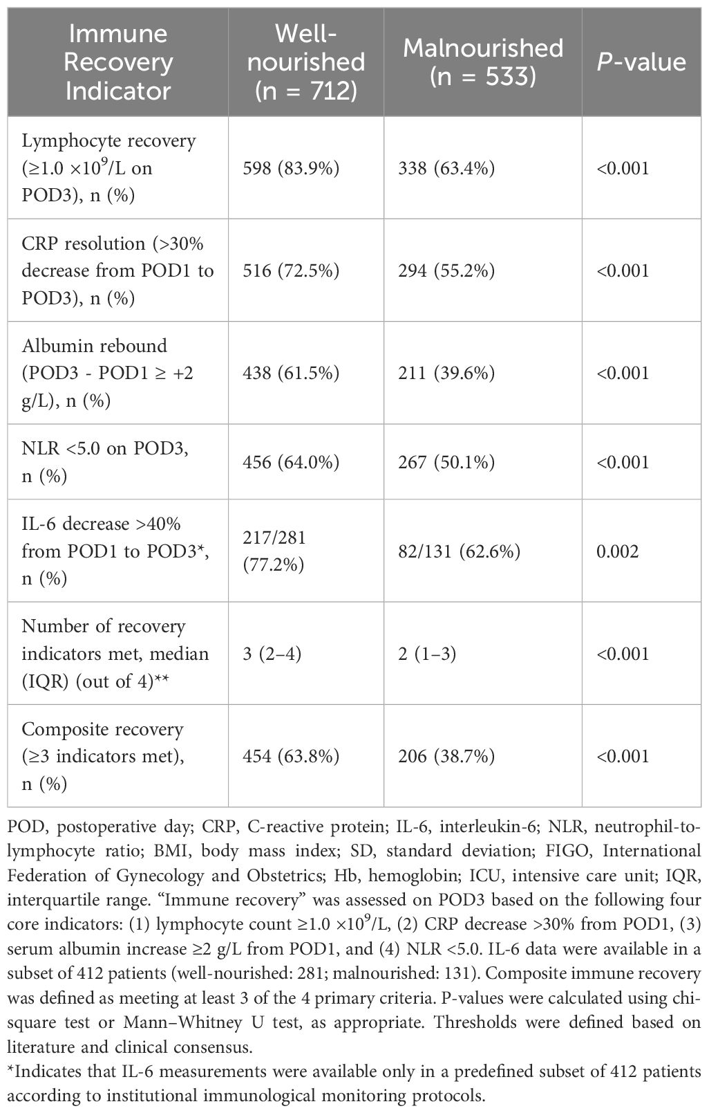 Our findings substantiate and extend existing evidence linking malnutrition to postoperative vulnerability in cancer patients. While hypoalbuminemia and low BMI have previously been associated with increased morbidity and mortality in gynecologic oncology (18, 19), most prior research has not examined immune recovery as a distinct biological endpoint. By focusing on lymphocyte count on postoperative day 3 (POD3)—a clinically validated surrogate marker of immune function in the immediate postoperative period—our study contributes to the growing clinical understanding of host immune restoration following surgical stress. This approach is supported by recent evidence in spine surgery patients, where lower POD3 lymphocyte levels were significantly associated with increased risk of postoperative infections, reinforcing its prognostic utility in immunologic surveillance (20). Similarly, in minimally invasive thoracic surgery for non–small cell lung cancer, POD3 leukocyte and lymphocyte dynamics were shown to correlate with surgical stress intensity and early recovery outcomes, further validating this metric as a reliable indicator of immune recovery (21). Lymphocyte count <1.0 ×109/L has been widely adopted in immune-oncology studies as a threshold indicating immunosuppression, particularly in the perioperative setting (22, 23). Our inclusion of complementary markers such as CRP, albumin kinetics, and NLR further strengthens the multidimensional assessment of postoperative immunologic recovery.