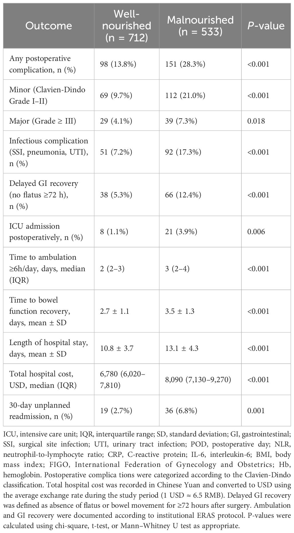 Table 1 presents the baseline characteristics of 1,245 patients stratified by preoperative nutritional status. Compared to the well-nourished group, malnourished patients were significantly older (58.1 ± 12.1 vs. 54.2 ± 11.4 years, P < 0.001) and had lower BMI (22.3 ± 4.1 vs. 24.5 ± 3.6 kg/m², P < 0.001). The malnourished group had a higher proportion of postmenopausal women, advanced-stage cancers (FIGO III–IV: 70.2% vs. 34.7%, P < 0.001), and ovarian cancer cases. They also had higher rates of comorbidities including anemia (46.3% vs. 23.6%, P < 0.001), hypertension, and diabetes. Laboratory indicators showed significantly lower serum albumin and lymphocyte counts and higher CRP levels in malnourished patients, suggesting a poorer systemic and immunologic baseline.