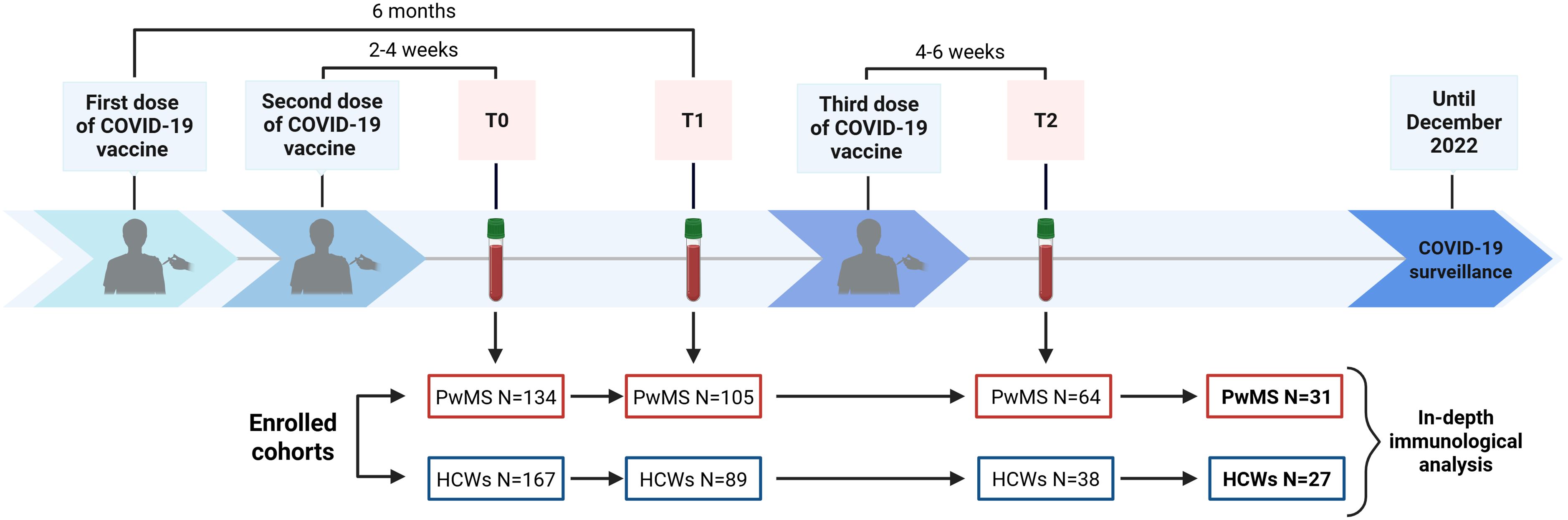 Figure 1. Timeline of COVID-19 vaccination and blood sample collection. The flow chart displays the enrolment and sample collection at T0 (2–4 weeks after the second dose), T1 (6 months after the first dose) and T2 (4–6 weeks after the third dose), excluding subjects lost to follow-up. Out of 64 PwMS and 38 HCWs who completed blood sampling at all designated time points, a convenience sample consisting of 31 PwMS and 27 HCWs was selected for an in-depth immunological characterization. COVID-19, COronaVIrus Disease 2019; HCWs, healthcare workers; PwMS, patients with multiple sclerosis. Created in https://BioRender.com.