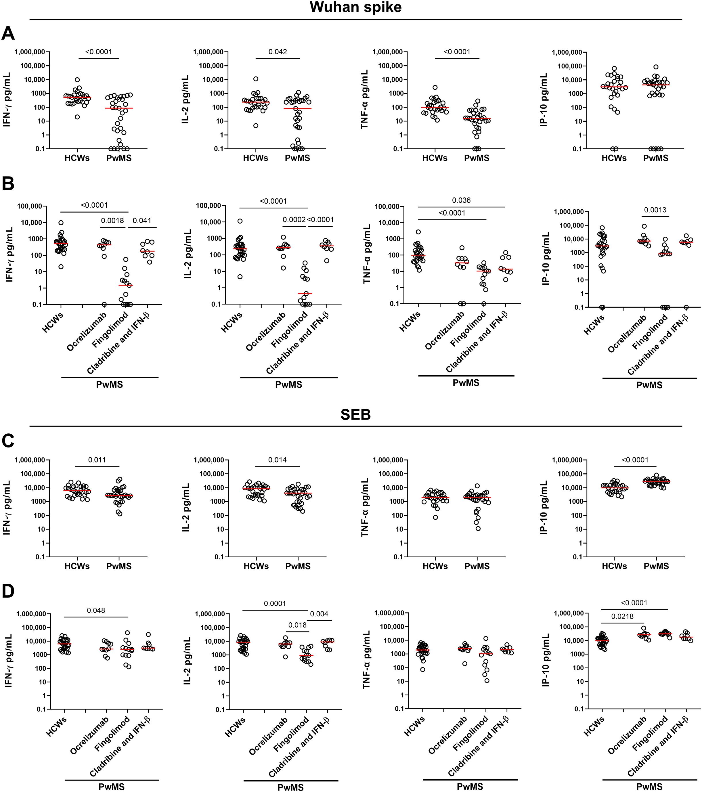 Figure 2. Cytokine/chemokine response to SARS-CoV-2 Wuhan spike peptides and SEB in HCWs and PwMS after 4–6 weeks from the third vaccine dose. Comparison of the cytokine response to Wuhan spike (A, B) and SEB (C, D) between HCWs and PwMS. (B, D) PwMS were stratified by the current therapy into three groups: ocrelizumab (n=10), fingolimod (n=13) and cladribine/IFN-β (n=8). IFN-γ, IL-2, TNF-α and IP-10 concentrations were expressed in pg/mL with median values indicated by red lines. For the statistical analysis, Mann-Whitney U test was performed to compare HCWs and PwMS (A, C), while for the comparison among groups the Kruskal-Wallis test followed by the Dunn’s multiple comparisons test was used (B, D). Differences with p values < 0.05 were considered significant. HCWs, healthcare workers; PwMS, patients with multiple sclerosis; SEB, Staphylococcal enterotoxin B; IFN, interferon; IL, interleukin; TNF, tumor necrosis factor; IP-10, interferon gamma-induced protein 10.