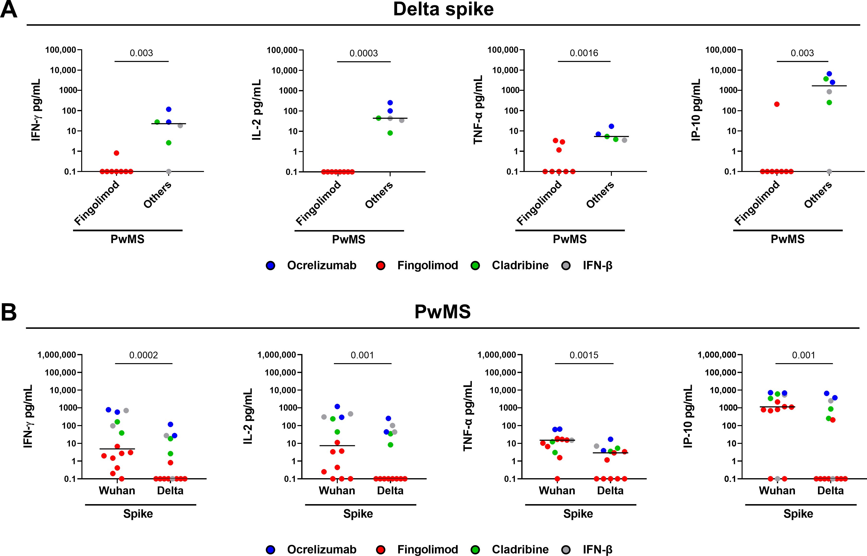 To investigate whether COVID-19 vaccination elicited an immune response against SARS-CoV-2 variants of concern, we evaluated cytokine production after stimulation with peptides derived from the SARS-CoV-2 Delta variant (B.1.617.2) in a subgroup of PwMS (n=14). As shown in Figure 3A, the T-cell response to Delta variant significantly differed among DMTs. Specifically, most PwMS treated with ocrelizumab, cladribine, or IFN-β mounted a T-cell response to Delta spike with production of both Th1 cytokines and IP-10. On the other hand, patients treated with fingolimod showed a markedly reduced response compared to other DMTs (IFN-γ: p=0.003; IL-2: p=0.0003; TNF-α, p=0.0016; IP-10, p=0.003). There is no response to Delta spike peptides in fingolimod-treated patients; only one to IFN-γ, three to TNF-α, and one to IP-10. Compared to the response induced by the Wuhan spike peptides, the magnitude of the T-cell response to the Delta variant peptides was significantly lower (IFN-γ: p=0.0002; IL-2: p=0.001; TNF-α, p=0.0015; IP-10, p=0.001) (Figure 3B).