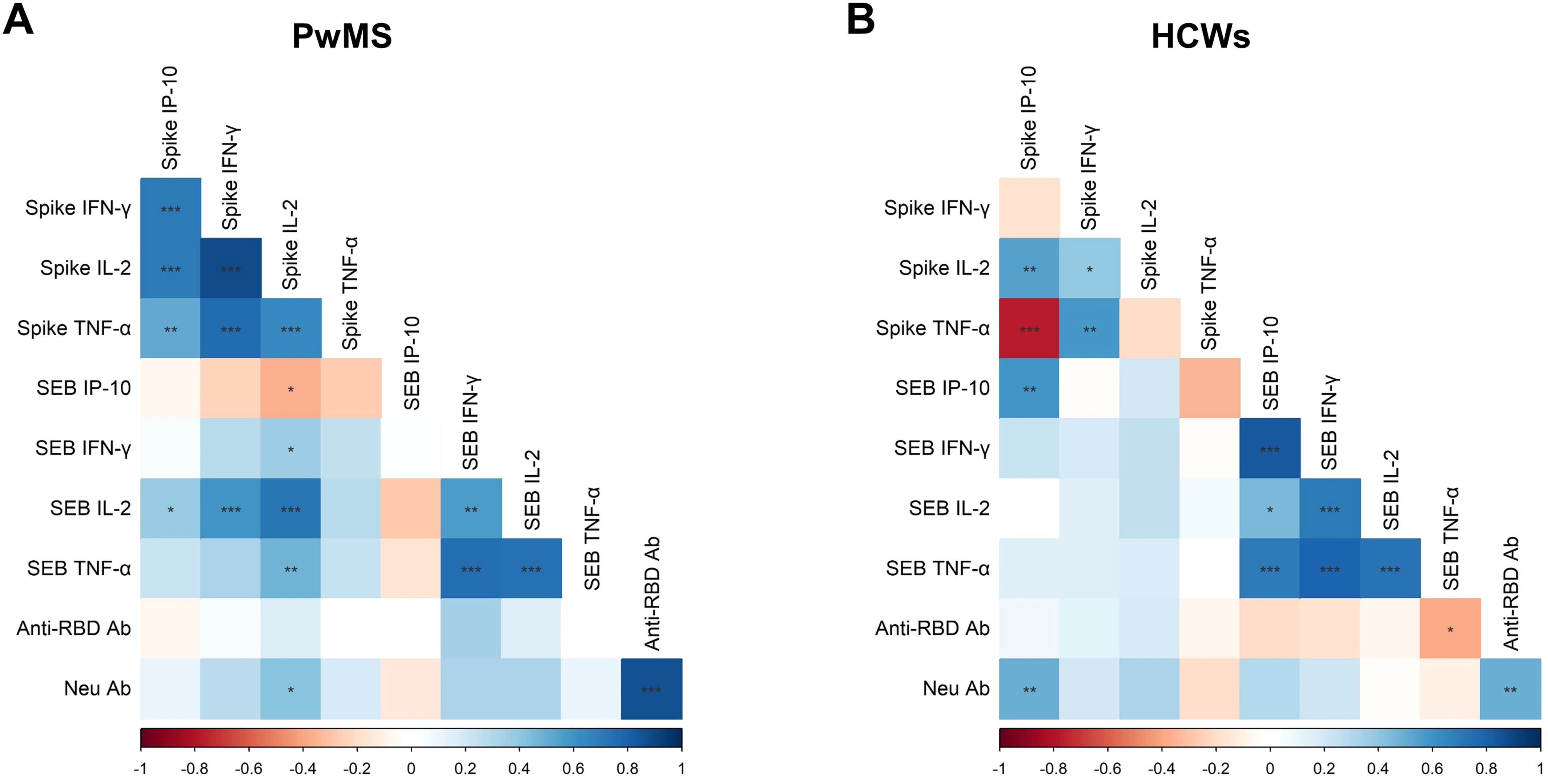 Figure 4. Correlations among the immunological parameters. Correlation matrices in PwMS (A) and HCWs (B) include the following variables: cytokine/chemokine (IFN-γ, IL-2, TNF-α and IP-10) response to SARS-CoV-2 Wuhan spike peptides and SEB, as well as antibody response measured as anti-RBD and neutralizing antibodies. For the analysis, the non-parametric Spearman’s rank test was performed. Positive (blue) and negative (red) correlations are indicated according to the colour-grade scale, and the colour intensity depends on the strength of the correlation coefficient (ρ). The significance level threshold used is the following: *p<0.05, **p<0.01, ***p<0.001.