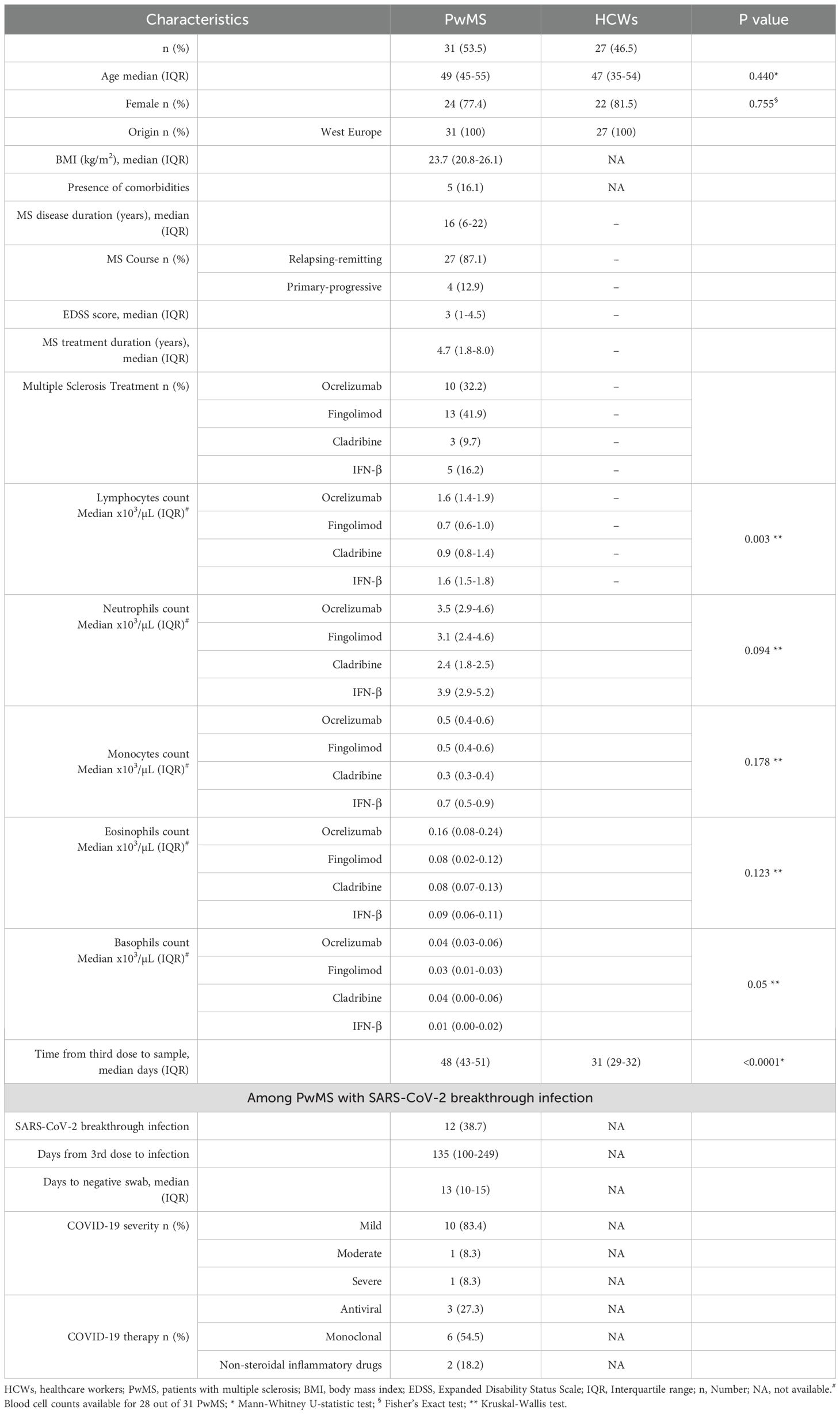From established cohorts of 167 HCWs and 134 PwMS previously evaluated for immune response to COVID-19 vaccination in related studies (13, 23, 38, 53), a subgroup of 27 HCWs and 31 PwMS, who completed blood sampling at all established time points, was selected for an in-depth analysis of the immunological response 4–6 weeks after the third vaccine dose (Figure 1).