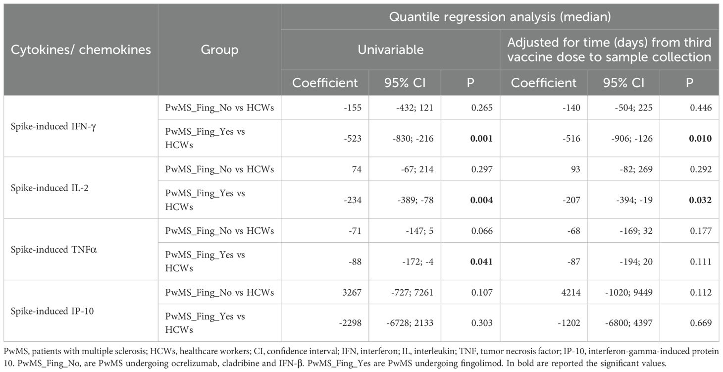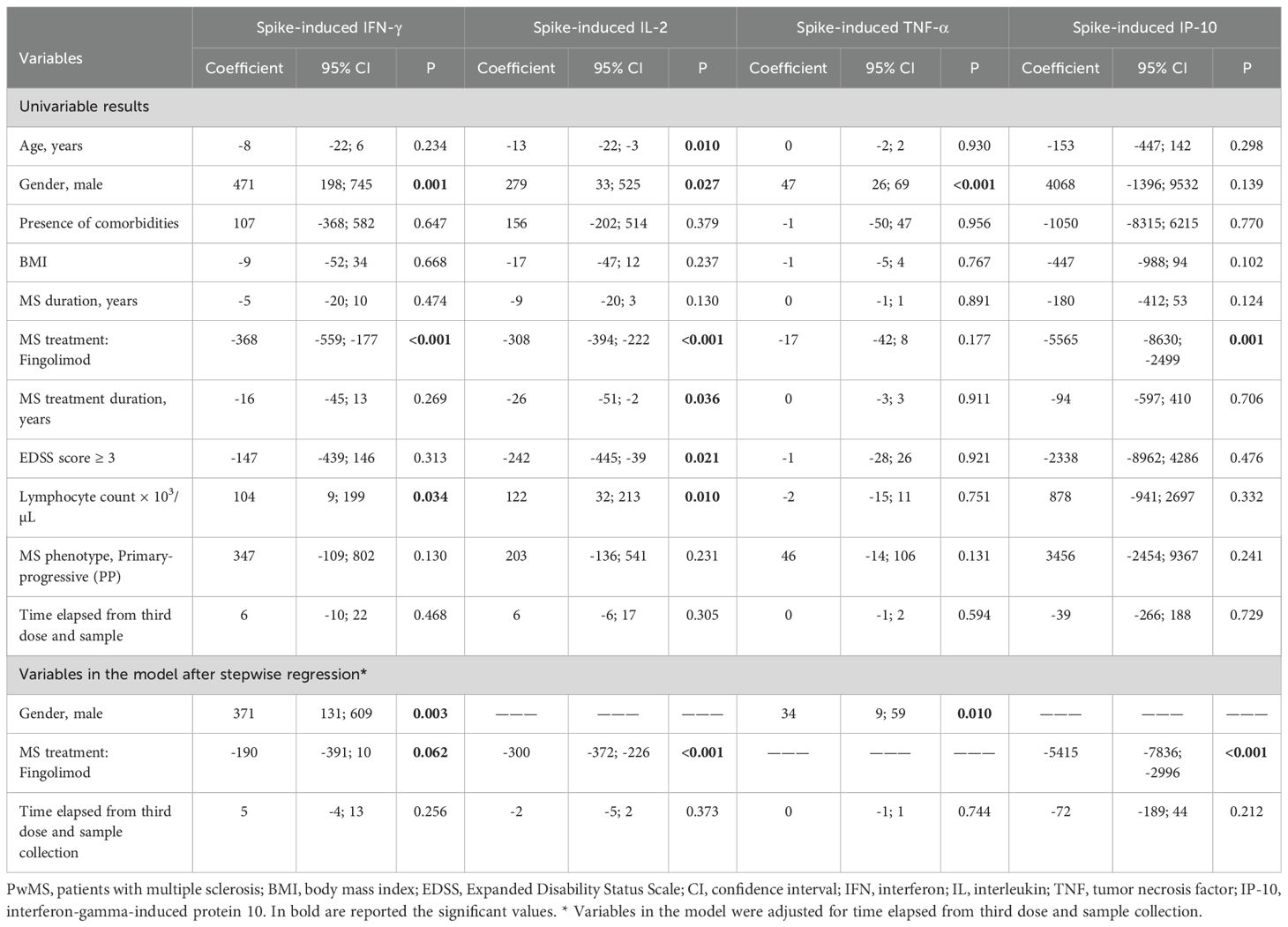 To account for potential demographic and clinical confounders of cytokine production, a quantile regression analysis was performed. In the analysis, dependent variables (i.e., IFN-γ, IL-2, TNF-α and IP-10) and the following covariates were included: age, sex, body mass index (BMI), type of DMT, disease and treatment duration, lymphocyte count, Expanded Disability Status Scale (EDSS) score, presence of comorbidities, MS disease phenotype, and time from the third vaccine dose to sample collection. Covariates with p < 0.05 were entered in the stepwise regression model to identify the most influential factors.