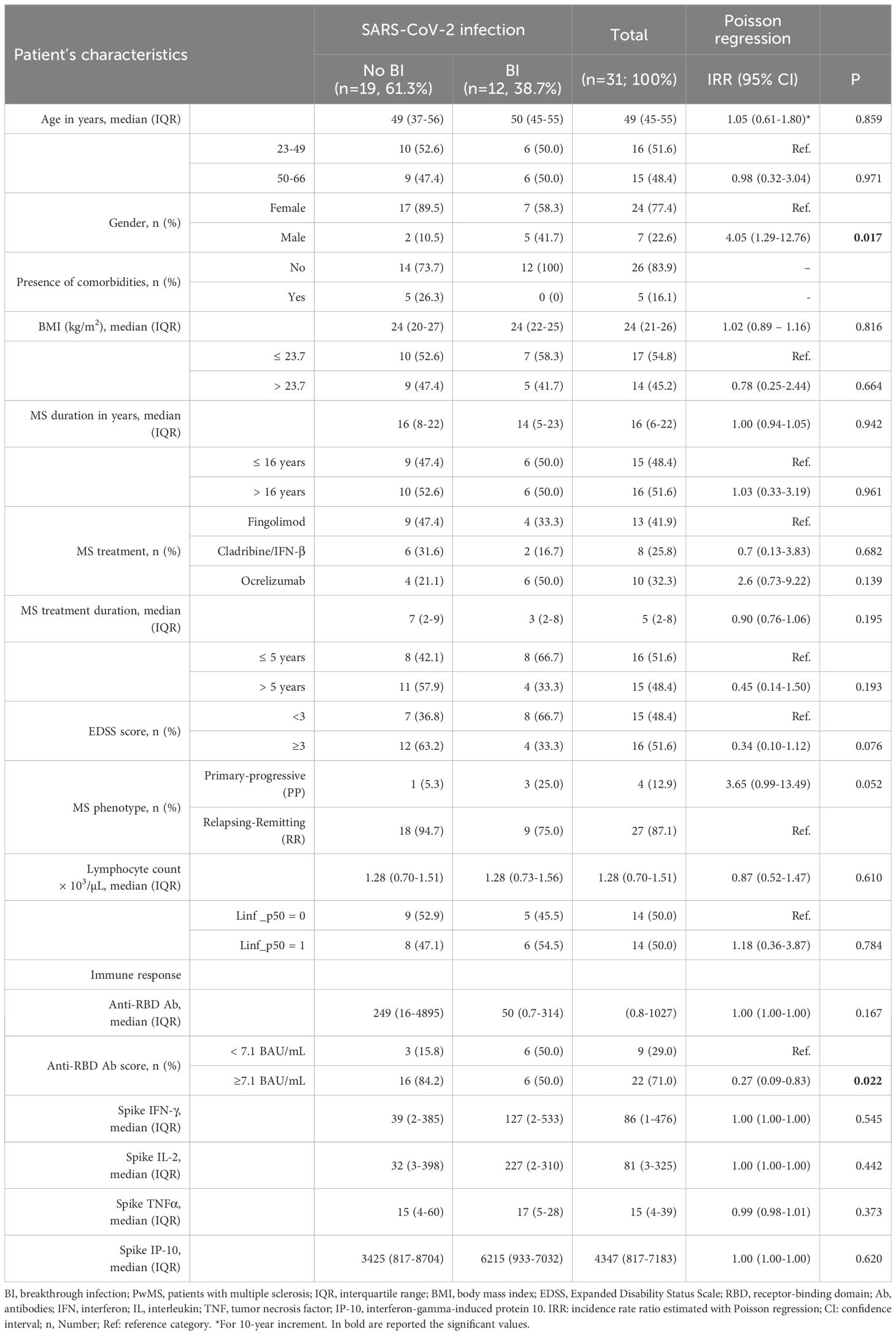 Among the demographic and clinical factors analyzed, sex emerged as a significant variable associated with the risk of BI in PwMS. Specifically, male patients exhibited a 4-fold increased risk of BI compared to females. This finding is consistent with previously reported sex-related differences in vaccine-induced response, wherein females mount a more robust immune compared to males (71, 72). Moreover, the relapsing-remitting phenotype of MS disease was associated with a greater protection compared to the primary progressive form, thus confirming previous data (38, 73).