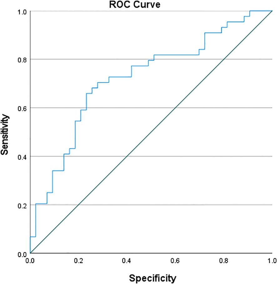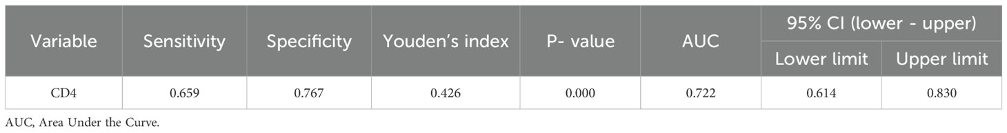 ROC curve analysis of CD4 showed an AUC of 0.722, with a sensitivity of 65.9% and specificity of 76.7%. The Youden’s index(Table 6; Figure 1).