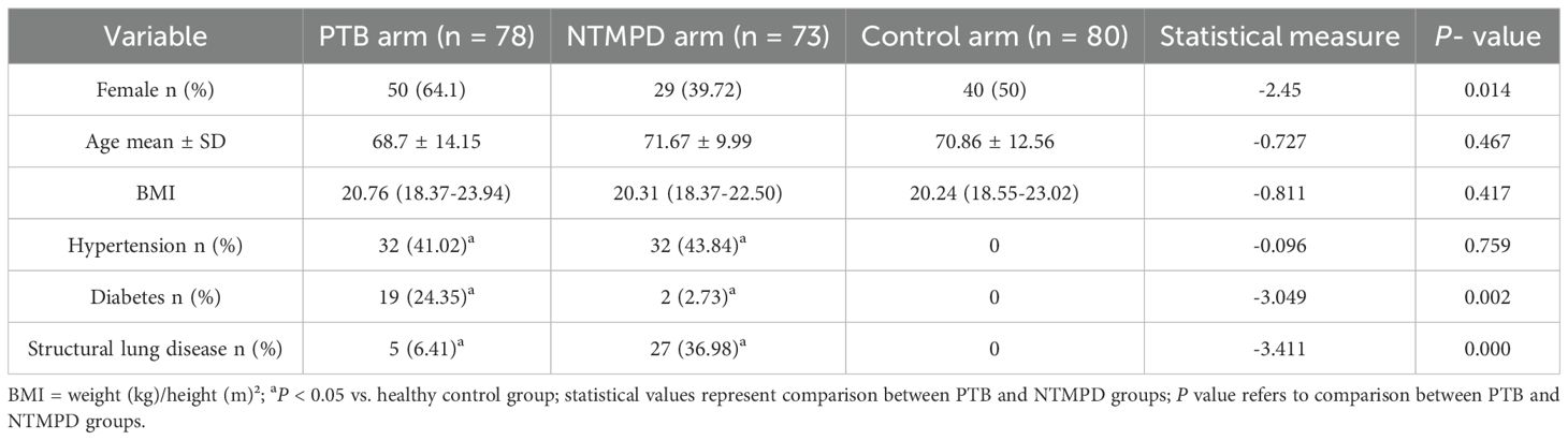 This study included 78 PTB patients, 73 NTMPD patients, and 80 healthy controls. No significant differences in age or BMI were found among the three groups (P > 0.05), ensuring comparability. However, significant gender distribution differences existed between the PTB and NTMPD groups (P < 0.05). Additionally, significant differences in hypertension, diabetes, and structural lung disease were observed among the three groups (P < 0.05) (Table 1).