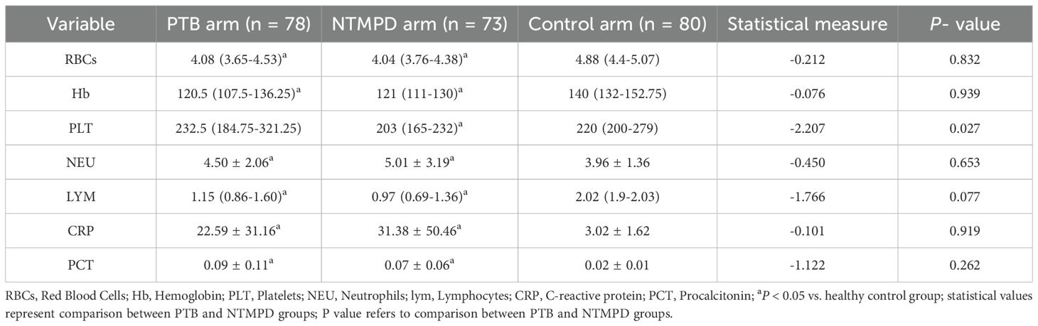 The PTB group had significantly higher platelet counts than the NTMPD group (P = 0.027), whereas differences versus controls were not significant (P > 0.05). Additionally, no significant differences were found between the PTB and NTMPD groups in red blood cell count, hemoglobin, neutrophils, lymphocytes, CRP, and PCT (P > 0.05). However, both the PTB and NTMPD groups showed significant differences in these blood parameters compared to the control group (P < 0.05) (Table 2).