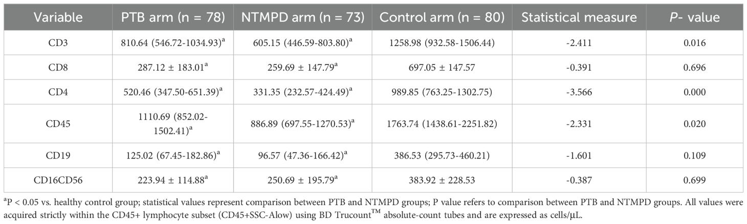 Significant differences were found in CD3, CD4, and CD45 levels between the PTB and NTMPD groups (P < 0.05), while CD8, CD19, and CD16CD56 levels showed no significant differences (P > 0.05). Compared to the control group, all these subsets (CD3, CD4, CD8, CD45, CD19, CD16CD56) in both the PTB and NTMPD groups exhibited significant differences (P < 0.05) (Table 3). Within the PTB group, CD4+ counts did not differ significantly between diabetic and non-diabetic patients (P = 0.881, Supplementary Table S1), suggesting that diabetes status had minimal influence on the main findings. Distribution summaries are provided in Supplementary Figure S2.