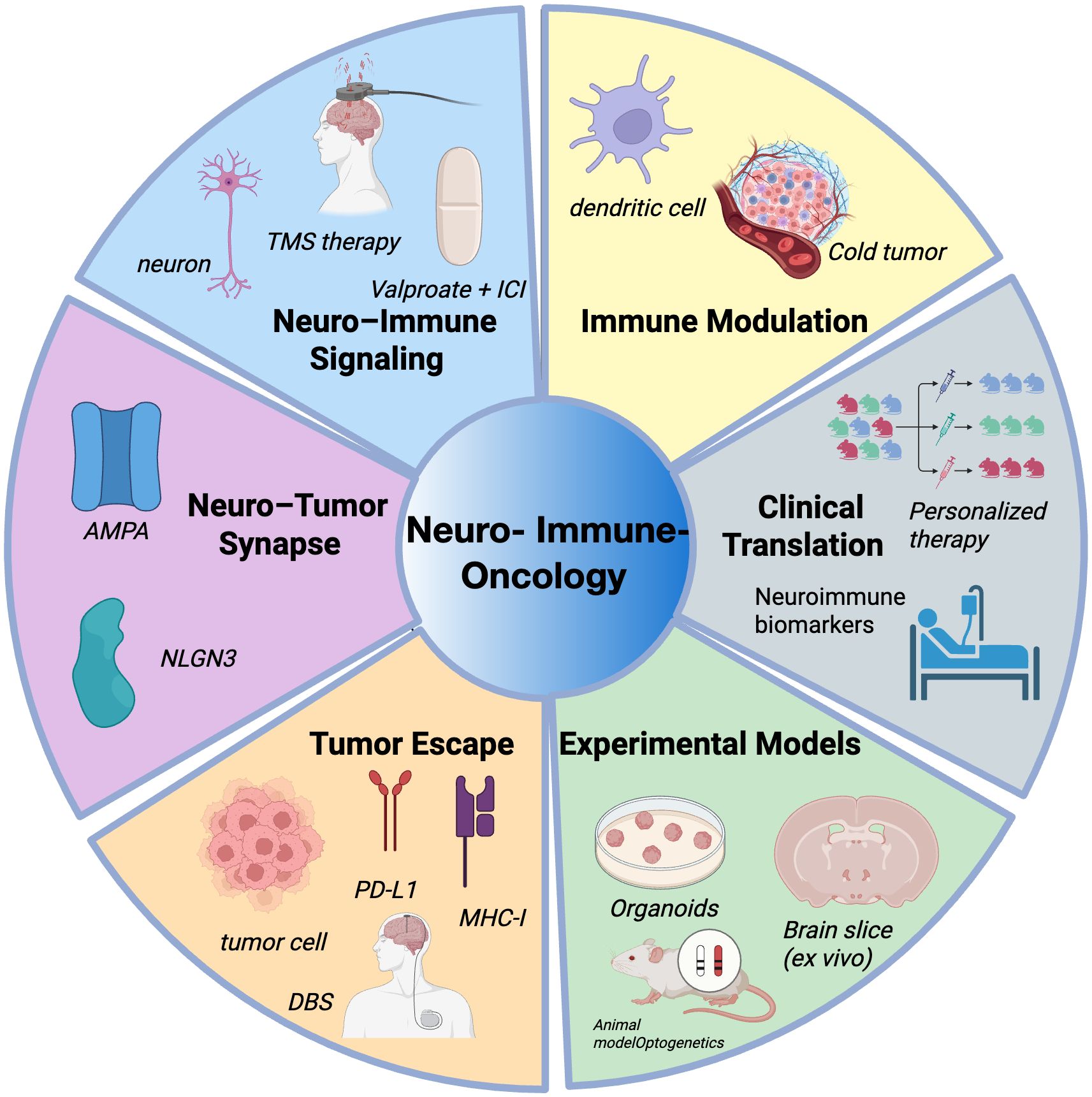 Neuroimmuno-oncology is an emerging interdisciplinary field that investigates the intricate interplay between the nervous system, the immune system, and cancer (1). As neuroscience, immunology, and oncology continue to converge, accumulating evidence suggests that the nervous system is not merely a conduit for information transmission but also an active regulator of tumor initiation, progression, and immune evasion (2–4). This field provides a novel framework to elucidate the mechanisms underlying immunologically “cold” tumors, supporting the development of combinatorial interventions aimed at enhancing immunotherapy responsiveness (5, 6). It is increasingly recognized as a promising direction for innovation in cancer treatment. The nervous system constitutes a critical component of the tumor microenvironment (TME) (7). Functionally active neurons can engage tumor cells through electrical and chemical synapses or modulate tumor behavior via the paracrine release of neuromodulatory factors (8, 9), including neuroligin-3 (NLGN3) (10), brain-derived neurotrophic factor (BDNF) (11, 12), glutamate (13), and norepinephrine (5). These signals reshape tumor cell metabolism, oncogenic signaling pathways, and immune phenotypes. Moreover, neuronal activity has been shown to promote the upregulation of immune checkpoints and the recruitment of immunosuppressive cell populations such as regulatory T cells (Tregs) and myeloid-derived suppressor cells (MDSCs), thereby fostering an immunosuppressive TME (3).