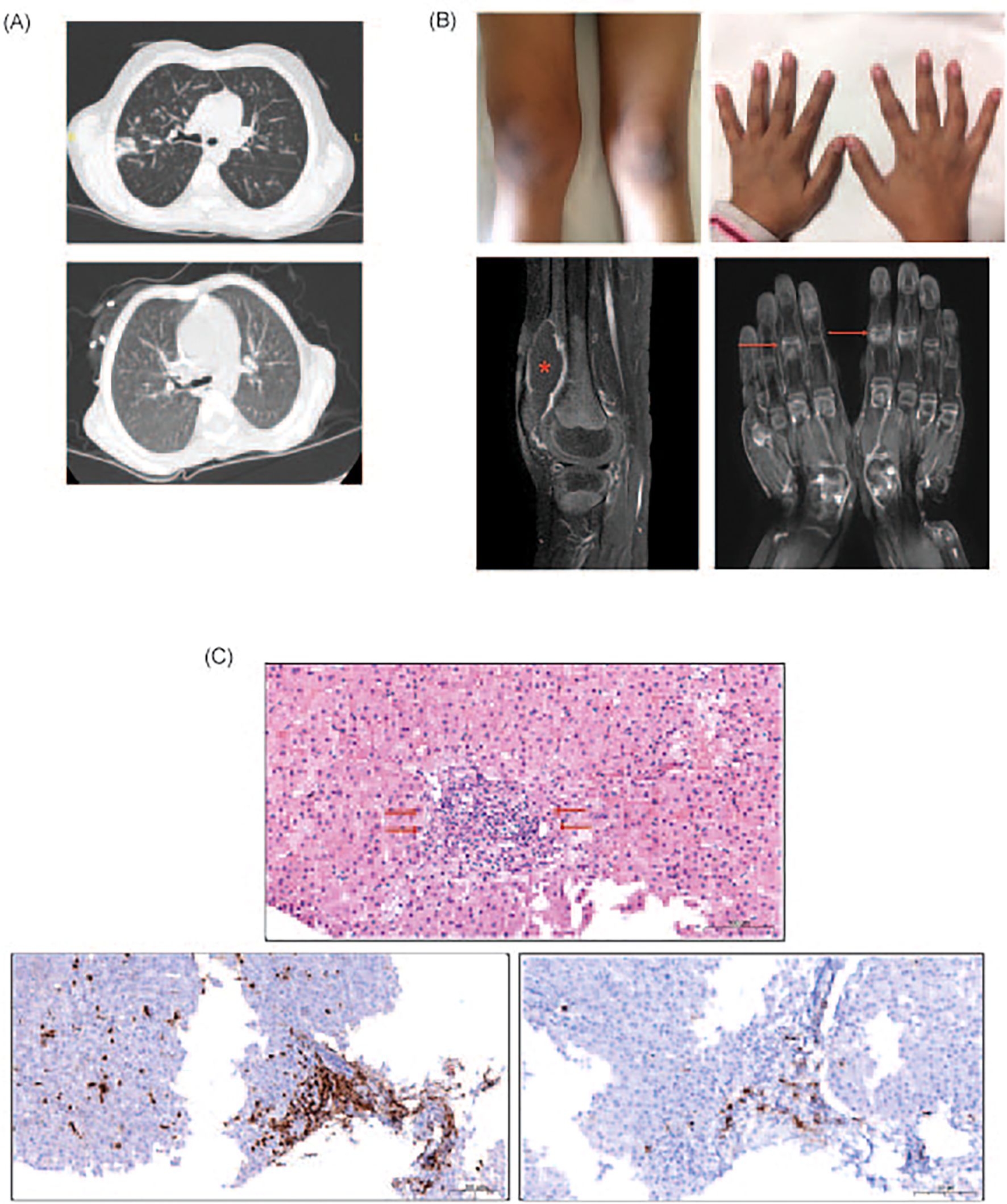 Figure 1. (A) Upper panel: Axial computer tomography (CT) image showing thickened bronchial walls and pneumonic infiltration in right upper lobe posterior segment. Image is from the episode where Aspergillus fumigatus was isolated from the bronchoalveolar lavage fluid of P1. Lower panel: Follow-up CT image demonstrating the complete resolution of the pneumonia. (B) Upper panel: Photos of arthritis on right knee and interphalangeal joints of P1 Lower panel: Contrast-enhanced MRI mages of both hands in coronal plan and right knee in sagittal plan showing synovial enhancements and inflammatory changes in interphalangeal and intercarpal joints (indicated with arrows). Please note the large effusion in the right knee (asterisk). (C) Upper panel: Hematoxylin eosin staining of the liver specimen from P3 showing the lymphocytic infiltration (indicated with arrow) at the periportal area in liver. Lower panel left: Immunohistochemistry staining of the liver specimen showing the CD3 positive lymphociytic infiltration at the periportal area Lower panel right: Immunohistochemistry staining of the liver specimen showing CD20 positive lymphocytic infiltration.