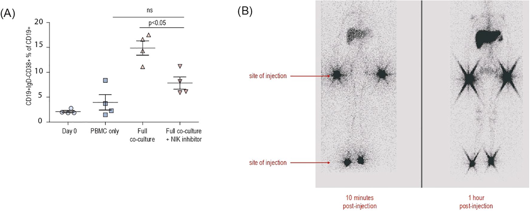 Figure 2. (A) Graph showing the percentage of the differentiation of plasmablast (CD19+IgD-CD38+) fraction within the CD19+ population. Combinations of peripheral blood mononuclear cells, activated dendritic cells and fibroblasts from each healthy individual donor were co-cultured with or without 2μ/ml B022 (NIK inhibitor) per well. (B) Lymphoscintigraphy of patient 1 following the HSCT at posttransplant year 4 showing the absence of lymph node structures.