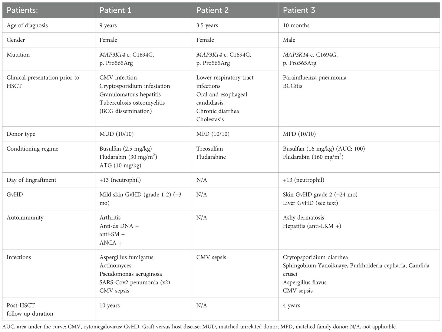 Introduction: Biallelic mutations in MAP3K14, encoding NF-κB-inducing kinase (NIK), disrupt non-canonical NF-κB signaling and lead to a rare inborn error of immunity marked by impaired lymphoid organ development, defective lymphocyte maturation, and susceptibility to recurrent infections. Hematopoietic stem cell transplantation (HSCT) has been considered a curative approach, yet its long-term efficacy remains unclear.