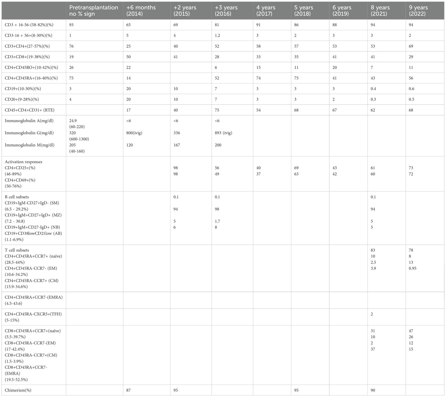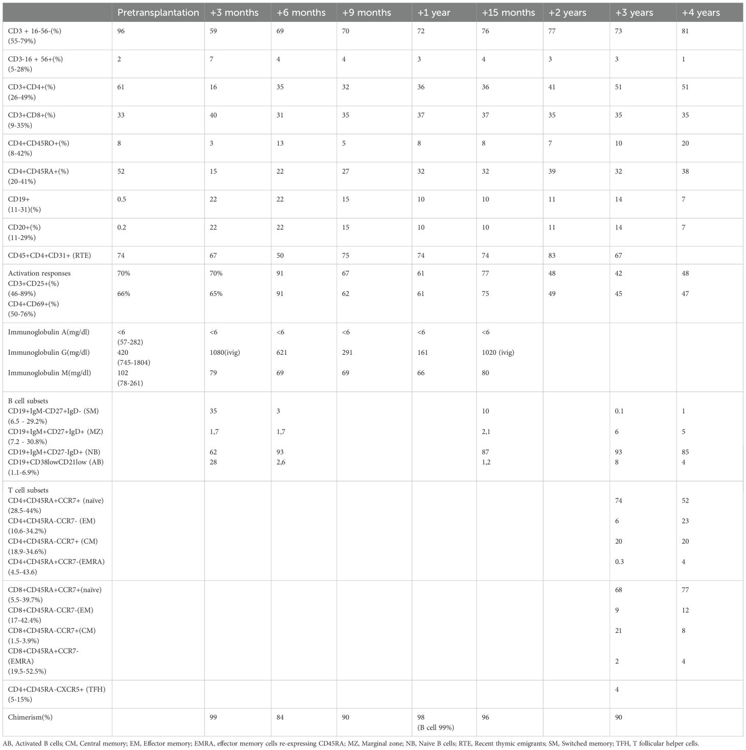 Previous studies have established that components of the non-canonical NF-κB signaling axis—namely NIK, IKK-α, and RELB—are indispensable for the functional maturation of medullary thymic epithelial cells (mTECs), which orchestrate central tolerance via ectopic expression of tissue-restricted antigens and the subsequent clonal deletion of autoreactive thymocytes (25–27). In light of this, and considering that our therapeutic strategy employed HSCT without concomitant thymic grafting, longitudinal surveillance for autoimmune phenomena was prioritized.