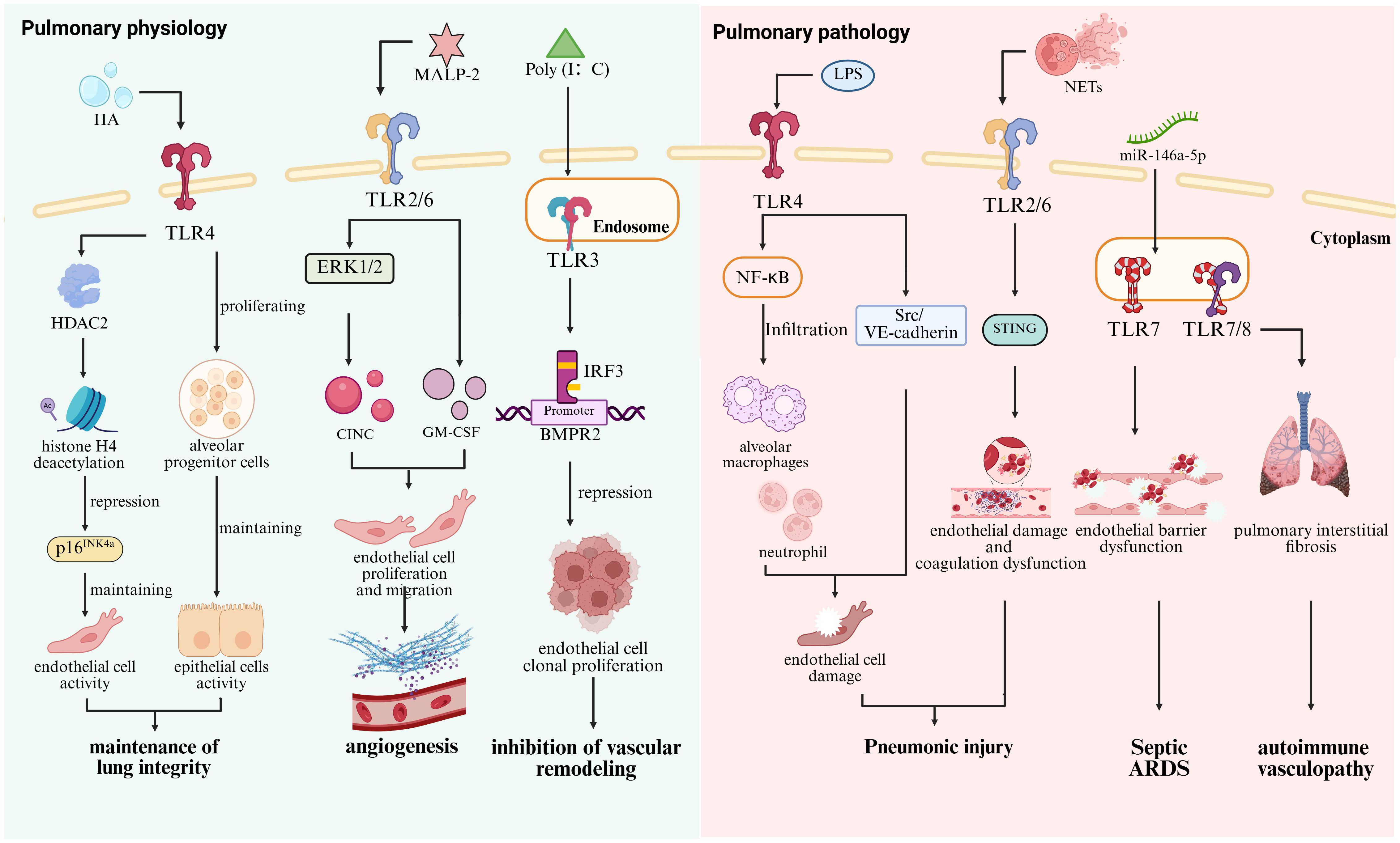 Figure 1. Roles of TLRs in pulmonary physiology and pathology. In lung physiological homeostasis, TLR4 senses intracellular HA to promote the proliferation and renewal of alveolar progenitor cells, while its activation in endothelial cells induces histone H4 deacetylation via HDAC2-mediated mechanisms, leading to the suppression of the senescence-associated gene p16INK4a and the maintenance of pulmonary integrity (30, 31, 37). The TLR2/6 agonist MALP-2 mediates ERK1/2 phosphorylation and CINC secretion upregulates GM-CSF expression and promotes pulmonary angiogenesis (34). In contrast, the TLR3 agonist Poly (I: C) suppresses endothelial cell clonogenic proliferation and attenuates vascular remodeling by enhancing IRF3 binding to the BMPR2 promoter (36). In contrast, excessive activation of TLR4 triggers Scr/VE-cadherin pathway activation and promotes alveolar macrophages and neutrophils through NF-κB hyperactivation (132). TLR2 in endothelial cells exacerbates endothelial injury and coagulation dysregulation by mediating NETs-STING interactions (130). In addition, TLR7 recognizes miR-146a-5p, leading to impaired endothelial barrier function and contributing to the development of sepsis-induced ARDS (133), while excessive TLR7/8 activation drives autoimmune vasculitis (134).