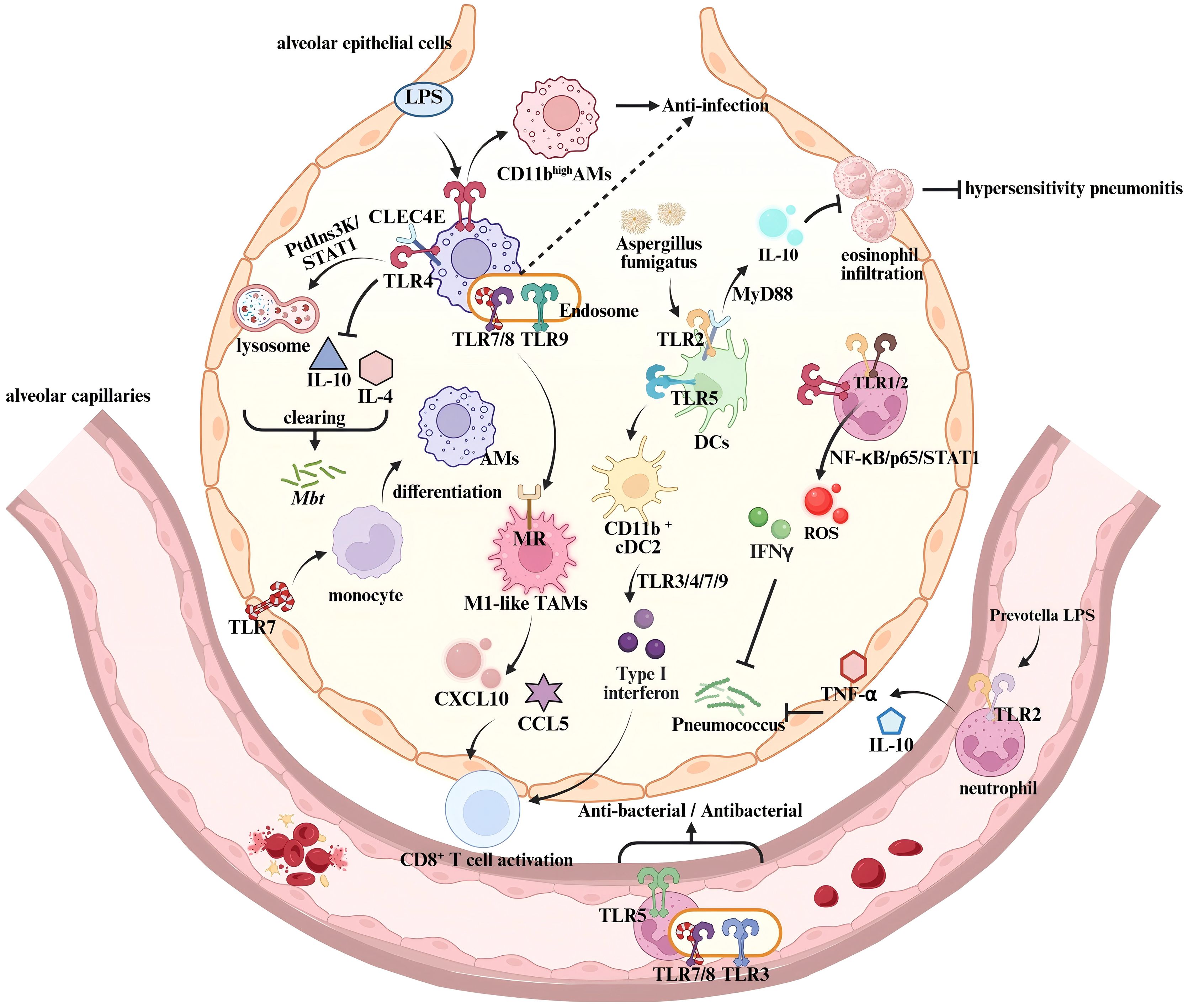 Figure 2. Regulation of innate immune responses by TLRs in the lung. In Alveolar macrophages, the co-activation of TLR4 and CLEC4E triggers the MyD88/PtdIns3K/STAT1/NF-κB signaling pathway, enhancing lysosome biogenesis while suppressing IL-10 and IL-4 expression, thereby controlling Mtb infection (68). LPS-activated TLR4 induces a phenotypic transition from CD11blow to CD11bhigh Alveolar macrophages, modulating their response to pathogen-associated components (72). TLR7 activation in epithelial barriers promotes monocyte differentiation into AMs, reducing pulmonary viral load (74). In the tumor microenvironment, endosomal TLR7/8 activation synergizes with MR signaling to drive TAMs toward an M1 anti-tumor phenotype (82). This enhances T cell recruitment by upregulating chemokines CXCL10 and CCL5, thereby boosting anti-tumor immunity. During Aspergillus fumigatus infection, TLR2-CLEC4E co-activation in dendritic cells increases IL-10 production via MyD88, suppressing eosinophil infiltration and negatively regulating hypersensitivity pneumonitis (69). TLR5 signaling promotes dendritic cell differentiation into CD11b+ cDC2 subset, which then releases type I interferons through TLR3/4/7/9 activation, enhancing T cell function (86, 87). Neutrophil-expressed TLR2 recognizes lipoproteins from Prevotella species in airways, inducing TNF-α and IL-10 production (75). TLR1/2 and TLR4 activation triggers NF-κB/p65/STAT1 signaling, promoting ROS and IFN-γ release, which mediate pulmonary antibacterial immunity (91, 92).