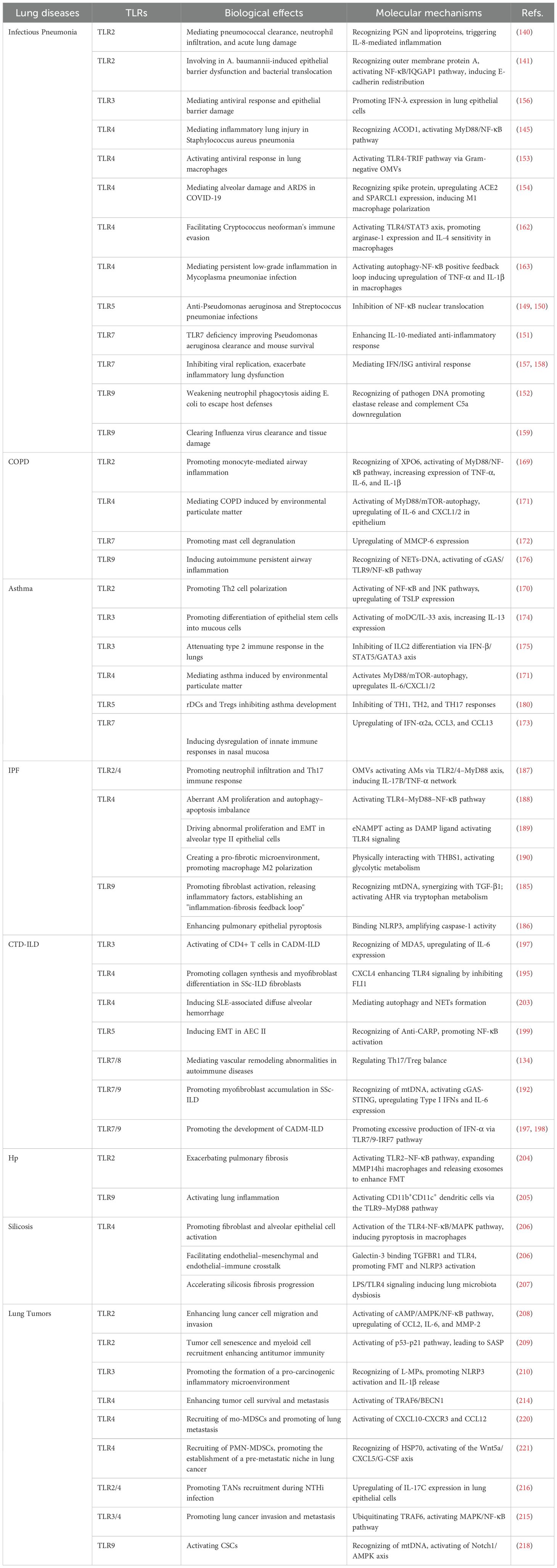 TLRs are expressed in various types of immune cells, including macrophages, dendritic cells (DCs), B lymphocytes, and T lymphocytes (14). They regulate the expression of pro-inflammatory cytokines and interferons by activating key transcription factors, such as NF-κB and IRFs, thereby aiding the host in defending against a wide range of pathogenic infections and adapting to complex microenvironmental changes (15). In the lung, TLRs are predominantly expressed in immune cells such as alveolar macrophages, DCs, and lymphocytes, forming the foundation of both innate and adaptive immune responses in the respiratory system (16). Studies have shown that TLRs play critical roles in the initiation and progression of lung diseases. For instance, activation of mucosal TLR5 has been demonstrated to delay thymic involution and protect against pulmonary fibrosis through enhancement of stem cell activity (17). X-linked recessive TLR7 deficiency in males results in impaired IFN immunity and severe COVID-19 pneumonia (18). In a house dust mite-induced murine model of allergic asthma, activation of TLR3 not only enhanced the antiviral response but alleviated the viral infection via regulating immunoproteasome dysfunction (19). In addition to immune cells, TLRs are also expressed in pulmonary epithelial cells and vascular endothelial cells, which play regulatory roles in maintaining lung function (20). Therefore, TLRs are essential for defending against pulmonary infections and maintaining regional immunity balance. However, excessive activation of TLRs can lead to pulmonary inflammation and immune dysregulation, contributing to the development of pneumonia, pulmonary fibrosis, and lung cancer. It has been shown that TLR4-mediated chronic inflammatory responses lead to an imbalance in the proportions of alveolar macrophages and CD163+ myeloid-derived monocyte-macrophages, which represents one of the fatal mechanisms underlying COVID-19 pathogenesis (21). Air pollutants such as polystyrene microplastics can induce pulmonary inflammation and apoptosis of lung cells by activating the TLR2/NF-κB signaling pathway, ultimately leading to lung injury and fibrosis (22). Therefore, the TLR family plays a crucial role in the regulation of pulmonary inflammation and regional immunity, representing a potential therapeutic target for the intervention of lung diseases.