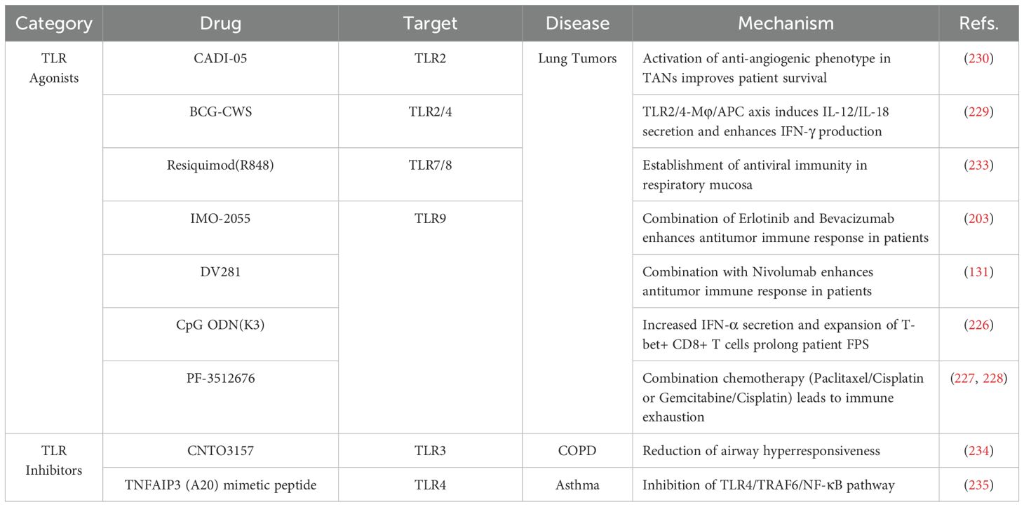 TLR2/4 agonists exhibit unique value in reshaping the immune microenvironment. Bacillus Calmette-Guérin-cell wall skeleton (BCG-CWS) leads to tumor regression in lung cancer patients by inducing the secretion of IL-12 and IL-18 via the TLR2/4-macrophage (Mφ)/antigen-presenting cell (APC) axis (229). Besides, the TLR-2 agonist CADI-05 activates an anti-angiogenic phenotype in TANs from patients with squamous cell lung carcinoma (no. NTC00680940) (230). However, the efficacy of TLR agonists is significantly influenced by diverse factors. In smokers and COPD patients, the expression of TLR2 in alveolar macrophage is significantly reduced (231). Nicotine restores TLR2/9 responsiveness by upregulating CD4+CD25+FoxP3+ Tregs (no. NCT00701207) (232). This variability underscores the risk of failure inherent in sole reliance on TLR-targeted agonist therapies and highlights their potential unsafety in non-responsive patient subpopulations. The central challenge for future research lies in precisely identifying patient cohorts who benefit from TLR modulation, defining the therapeutic window, and advancing biomarker-driven personalized therapy to balance efficacy and safety. Furthermore, the antiviral immune model established by the TLR7/8 agonist R848 in the respiratory mucosa offers new perspectives for combined interventions targeting virus-associated lung tumors (no. NCT02090374) (233).