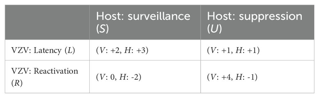 Under this formalized structure, when host immune surveillance is robust, VZV latency provides a moderate but stable fitness for both players. Conversely, premature viral reactivation in the presence of strong host immunity results in significant immunological retaliation, leading to viral suppression and a negligible viral payoff. In contrast, viral reactivation during a period of host immune suppression yields a high viral payoff, albeit at the cost of host damage.