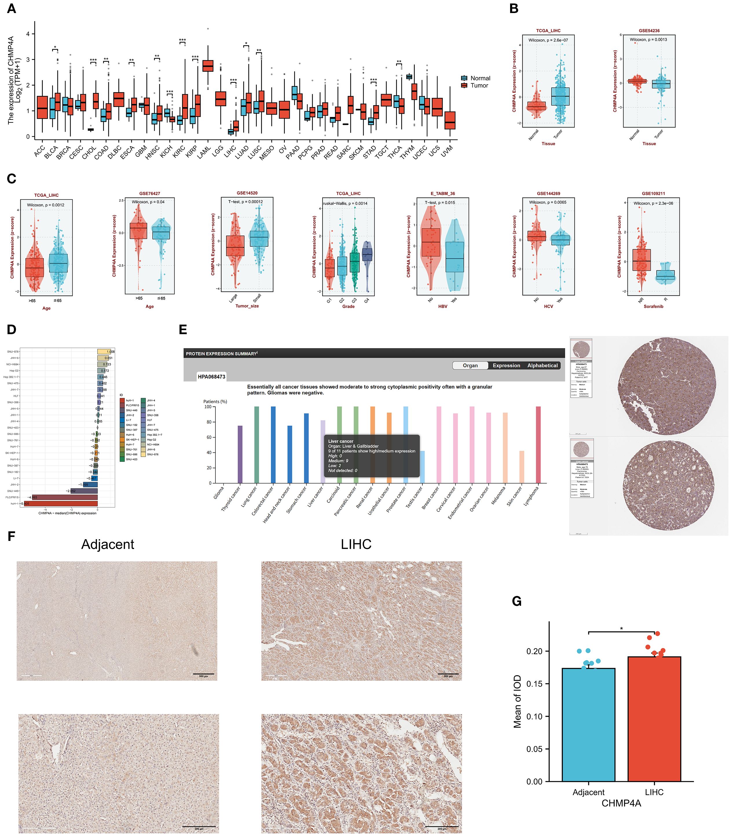 Figure 1. Expression Analysis of CHMP4A and Its Association with Clinical Features (A) Comparative expression analysis of CHMP4A in pan-cancer tissues versus adjacent normal tissues utilizing data from the TCGA and GETx databases. (B) Comparative expression analysis of CHMP4A in tumor versus normal tissues in LIHC using data from the TCGA and GEO databases. (C) Examination of the association between CHMP4A expression and clinical parameters in LIHC. (D) Comparative expression analysis of CHMP4A in hepatocellular carcinoma cell lines. (E) Pan-cancer protein expression profiling of CHMP4A, including representative IHC staining of tissue microarrays from the HPA database. (F) IHC analysis of CHMP4A in LIHC tumor tissues compared to paired adjacent non-tumor liver tissues. (G) Quantification of CHMP4A immunostaining using integrated optical density (IOD) analysis. *P<0.05, **P<0.01, ***P<0.001. CHMP4A, Charged Multivesicular Body Protein 4A; LIHC, liver hepatocellular carcinoma; TCGA, The Cancer Genome Atlas; GEO, Gene Expression Omnibus; AFP, Alpha-fetoprotein; IHC, immunohistochemistry; HPA, Human Protein Atlas; IOD, integrated optical density.