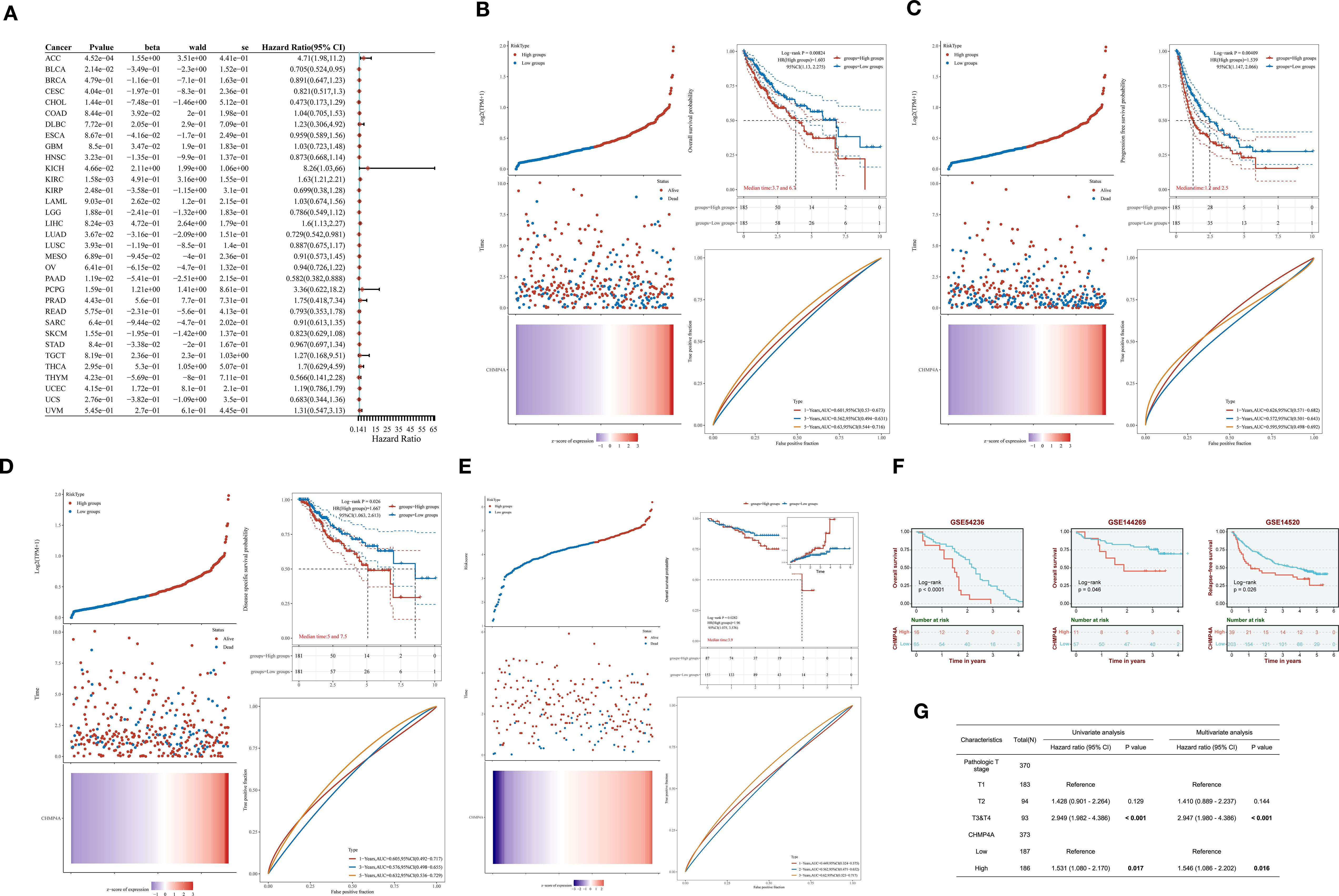 Figure 2. The prognostic relevance of CHMP4A expression was investigated across various cancers, with a specific focus on validation within LIHC cohorts. (A) A comprehensive pan-cancer Cox regression analysis was conducted to evaluate CHMP4A expression. (B) OS analysis of CHMP4A was performed using TCGA-LIHC data. (C) PFS analysis of CHMP4A was conducted utilizing TCGA-LIHC data. (D) DSS analysis of CHMP4A was carried out with TCGA-LIHC data. (E) OS analysis of CHMP4A was also performed using data from the ICGC. (F) External validation using independent GEO cohorts confirmed the prognostic significance of CHMP4A in LIHC. (G) The prognostic significance of CHMP4A expression in LIHC patients was further assessed through both univariate and multivariate analyses. AUC, Area Under Curve; CI, Confidence Interval; DFS, Disease-Free Survival; GEO, Gene Expression Omnibus; HR, Hazard Ratio; LIHC, Liver Hepatocellular Carcinoma; OS, Overall Survival; PFS, Progression-Free Survival; RFS, Relapse-Free Survival; ROC, Receiver Operating Characteristic; TCGA, The Cancer Genome Atlas; TPM, Transcripts Per Million; ICGC, International Cancer Genome Consortium.