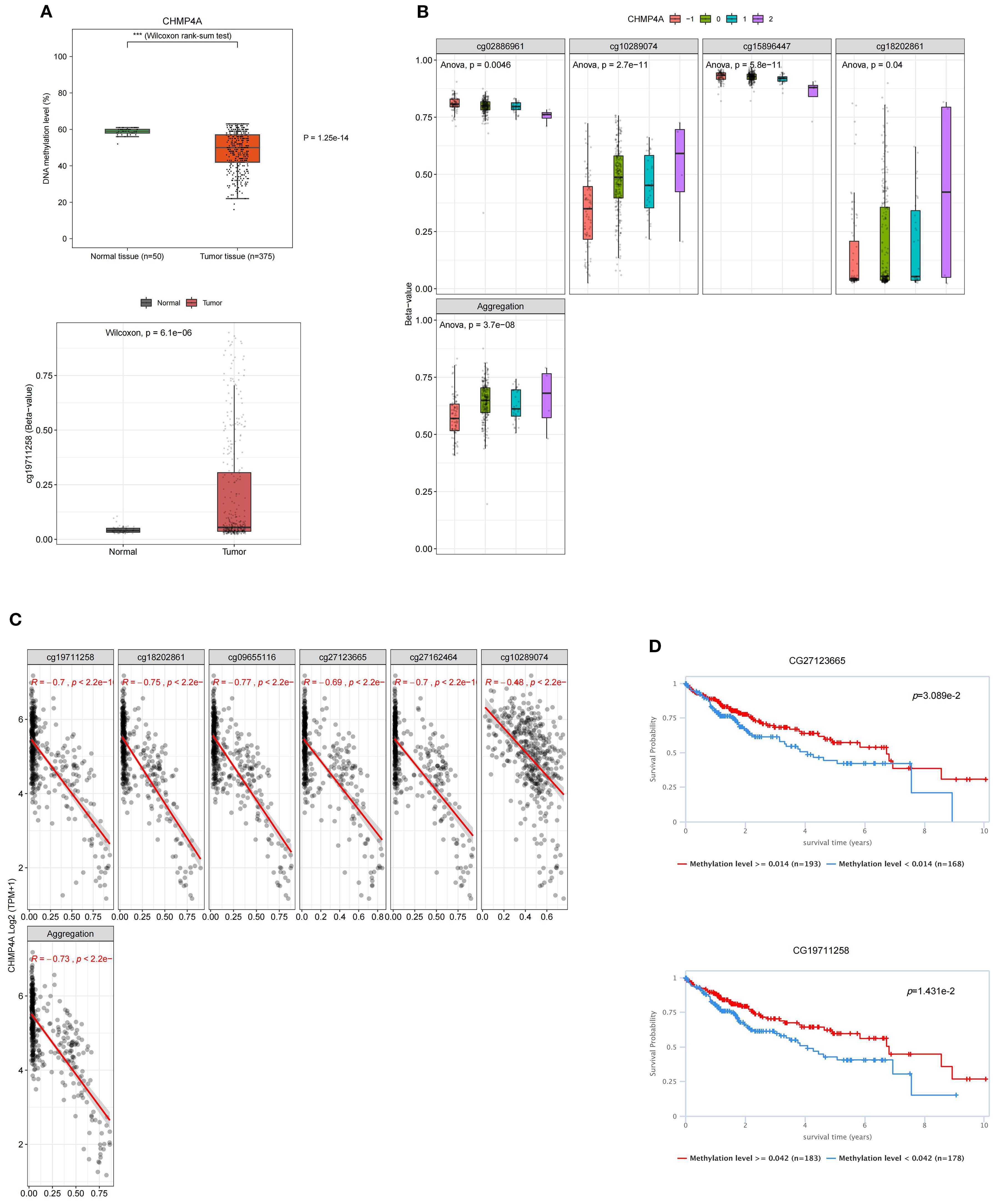 Figure 3. DNA methylation profiling of CHMP4A genomic features in LIHC. (A) Dynamics of promoter methylation in LIHC versus normal liver tissues. (B) Correlation between methylation levels of individual CHMP4A CpG sites and CNV status [deep deletion (-2), loss (-1), neutral (0), gain (1), amplification (2)]. (C) Correlation analysis between CHMP4A expression and its methylation status. (D) Association of CHMP4A methylation with patient survival outcomes. ***P<0.001. CpG, Cytosine-phosphate-Guanine dinucleotide; LIHC, Liver Hepatocellular Carcinoma; TCGA, The Cancer Genome Atlas; TNM, Tumor-Node-Metastasis staging system; CNV, copy number variation.