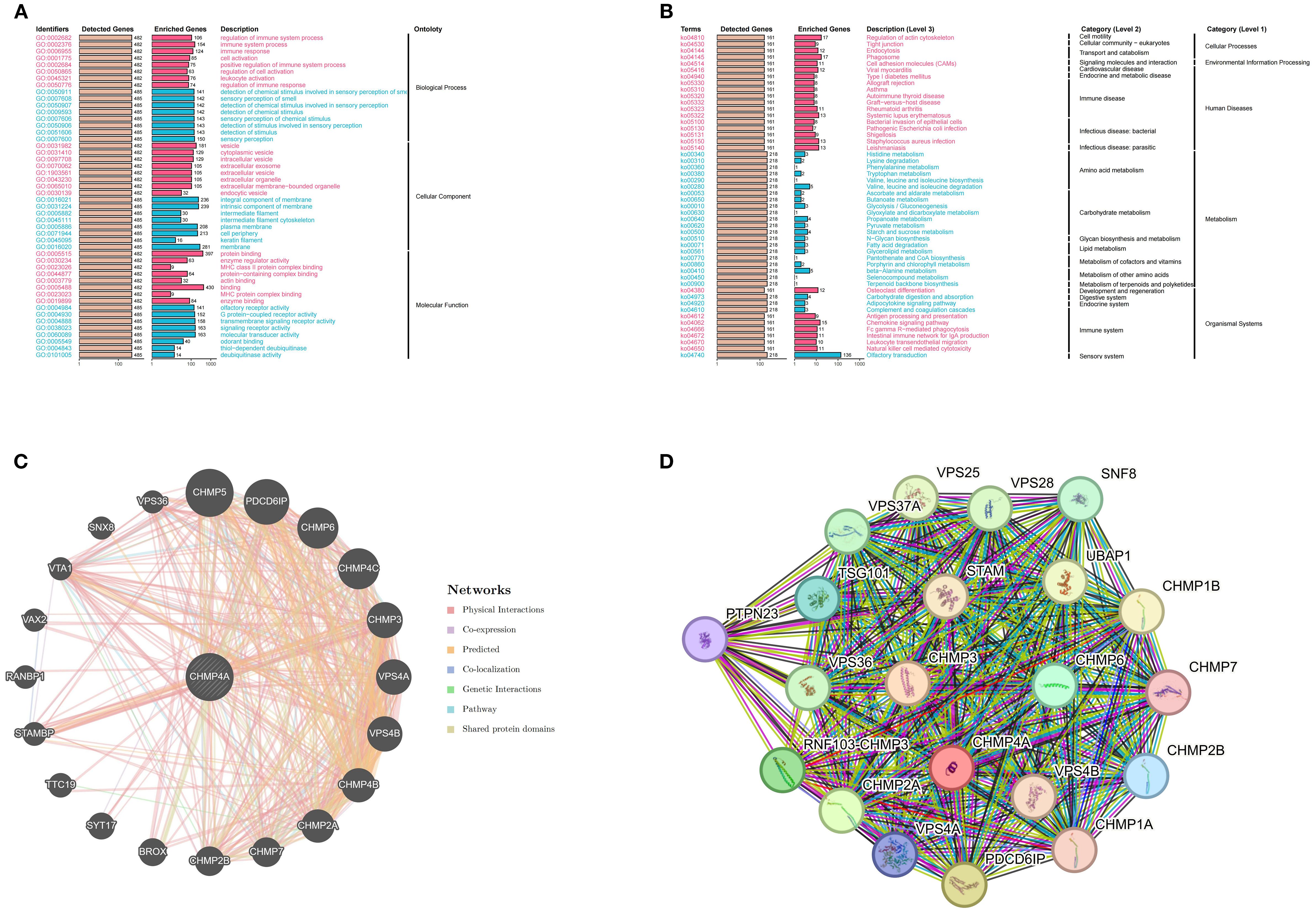 Figure 4. CHMP4A functional enrichment analysis across immune-related pathways and biological processes in LIHC. (A) GO enrichment analysis of CHMP4A associated biological processes. (B) KEGG pathway enrichment of CHMP4A. (C) Protein-protein interaction network analysis of CHMP4A in LIHC. (D) Gene Co-Expression Network Correlated with CHMP4A Expression Patterns in LIHC. LIHC, Liver Hepatocellular Carcinoma; CHMP4A, Charged Multivesicular Body Protein 4A; ES, Enrichment Score; GSEA, Gene Set Enrichment Analysis; GO, Gene Ontology; KEGG, Kyoto Encyclopedia of Genes and Genomes; CHMP4A, Charged Multivesicular Body Protein 4A; TCGA, The Cancer Genome Atlas.