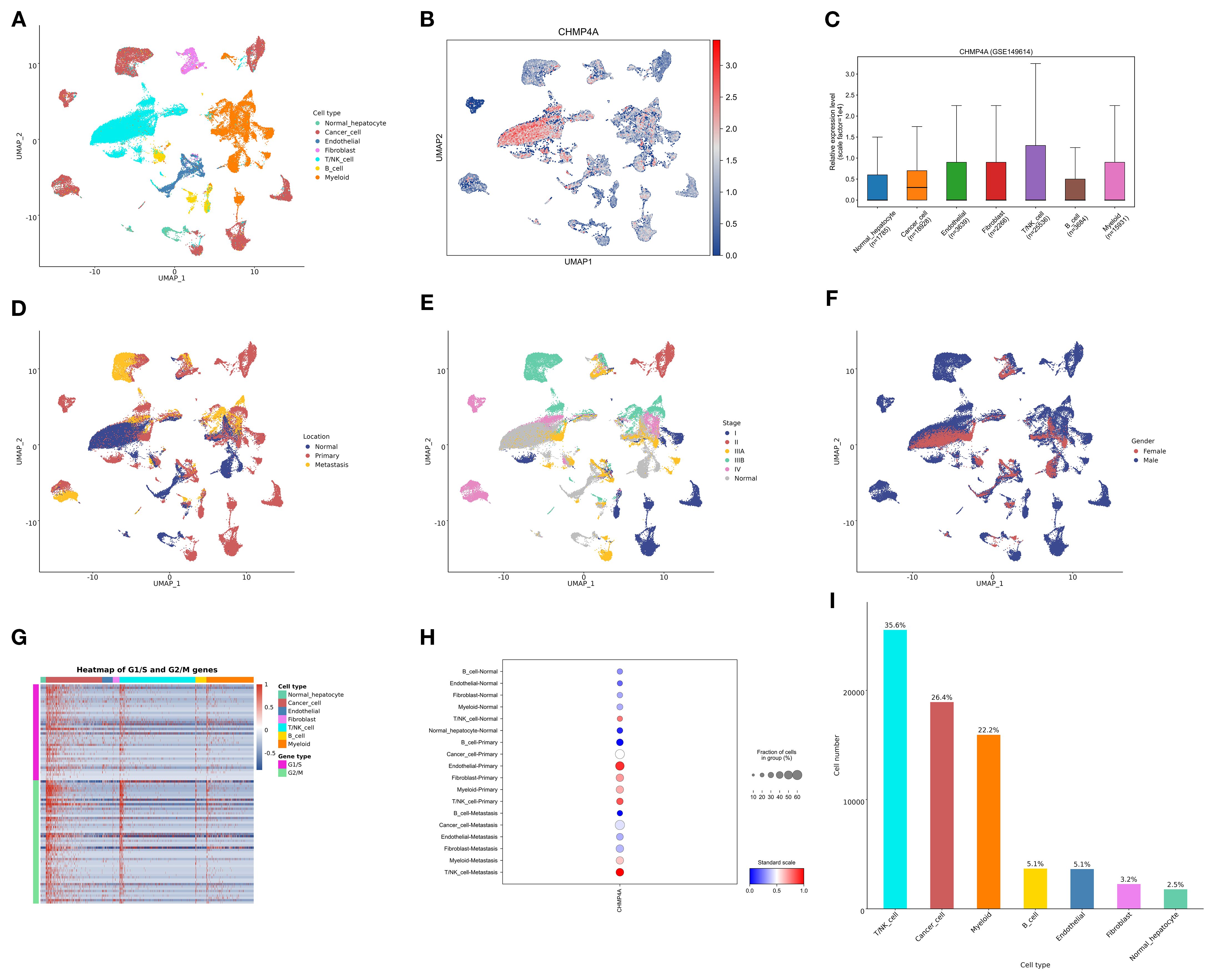 Figure 5. Single-cell analysis of CHMP4A in LIHC via scRNA-seq. (A) UMAP Visualization of Cell Type Distribution in LIHC. (B) UMAP Expression Profile of CHMP4A in LIHC. (C) Relative Expression Levels of CHMP4A Across Cell Types. (D) UMAP Visualization of Cell Distribution by Anatomical Location. (E) UMAP Visualization of Cell Distribution by Tumor Stage. (F) UMAP Visualization of Cell Distribution by Sex. (G) Heatmap of G1/S and G2/M Phase Transition Gene Expression Across Cell Types. (H) Expression Proportions of CHMP4A in Different Cell Types and Cancer Subtypes. (I) Statistics of Cell Number and Proportion for Each Cell Type. UMAP, Uniform Manifold Approximation and Projection; CHMP4A, Charged Multivesicular Body Protein 4A; CD4T_conv, Conventional CD4+ T cells; CD8T_typical, Typical CD8+ T cells; CD8T_exhausted, Exhausted CD8+ T cells; T_prolif, Proliferating T cells; Treg, Regulatory T cells; NK_cell, Natural Killer cell; B_cell, B lymphocyte; Mono/Macro, Monocyte/Macrophage; HCC, Hepatocellular Carcinoma; CC, Cholangiocarcinoma; G1/S, G1/S phase transition genes; G2/M, G2/M phase transition genes.