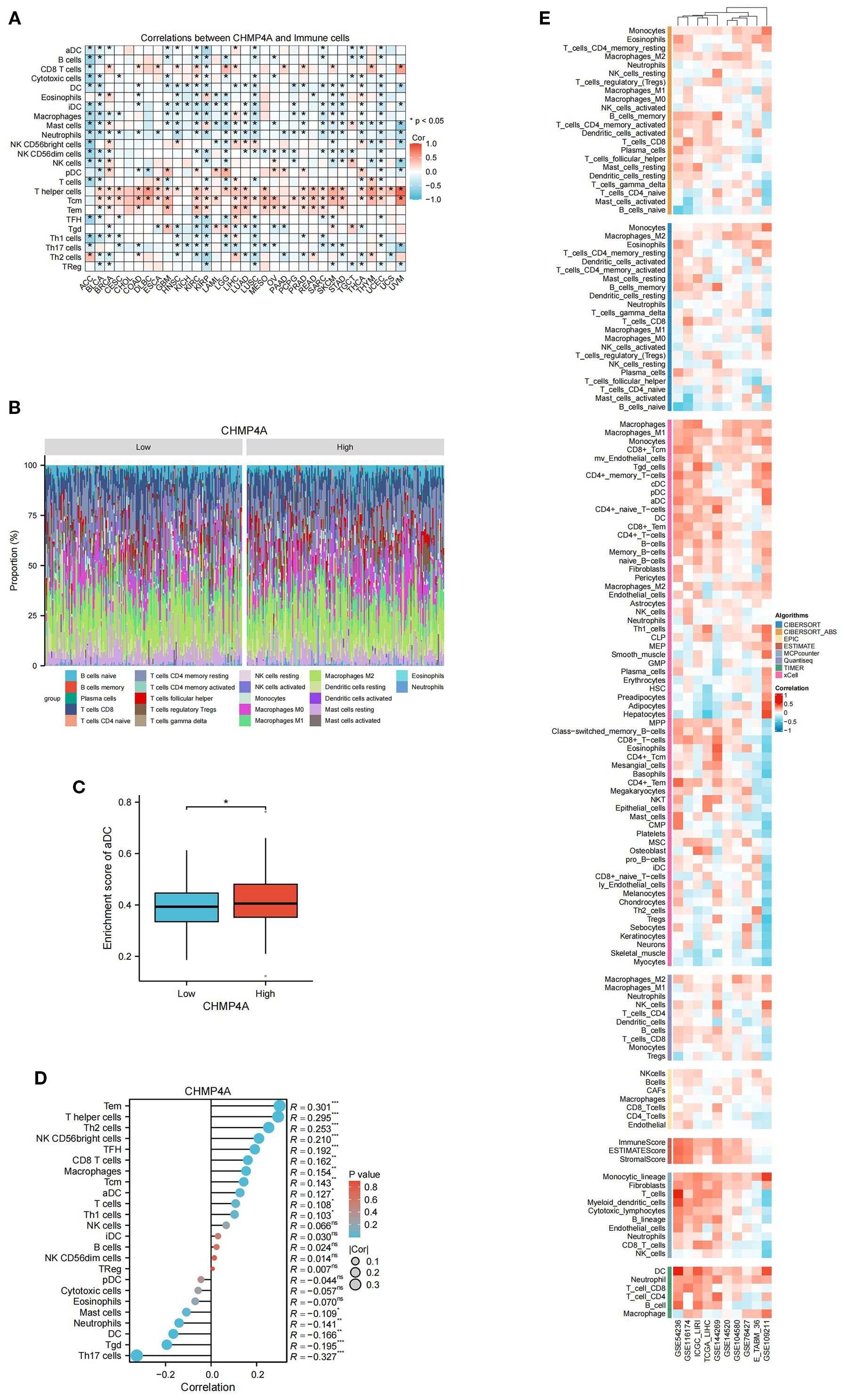 Figure 6. Integrative analysis of CHMP4A expression correlation with tumor microenvironment immune cells in LIHC. (A) Correlation of CHMP4A Expression with Immune Cells Across 33 Cancer Types. (B) Comparison of Immune Cell Proportions Stratified by CHMP4A Expression Levels (Low vs. High) in TCGA-LIHC. (C) Enrichment Score of Activated Dendritic Cells in LIHC Patients Stratified by CHMP4A Expression (Low vs. High). (D) Correlation Between CHMP4A Expression and Immune Infiltration in LIHC via ssGSEA Algorithm. (E) Correlation Between CHMP4A Expression and Immune Infiltration in LIHC Across Multiple Immune Infiltration Tools and Genomic Datasets. *P<0.05. CIBERSORT, cell-type identification by estimating relative subsets of RNA Transcripts; Cor, Pearson correlation coefficient; ESTIMATE, estimation of stromal and immune cells in malignant tumor tissues using expression data; LIHC, Liver Hepatocellular Carcinoma; Pval, p-value; TCGA, The Cancer Genome Atlas; xCell, cell type enrichment analysis tool.