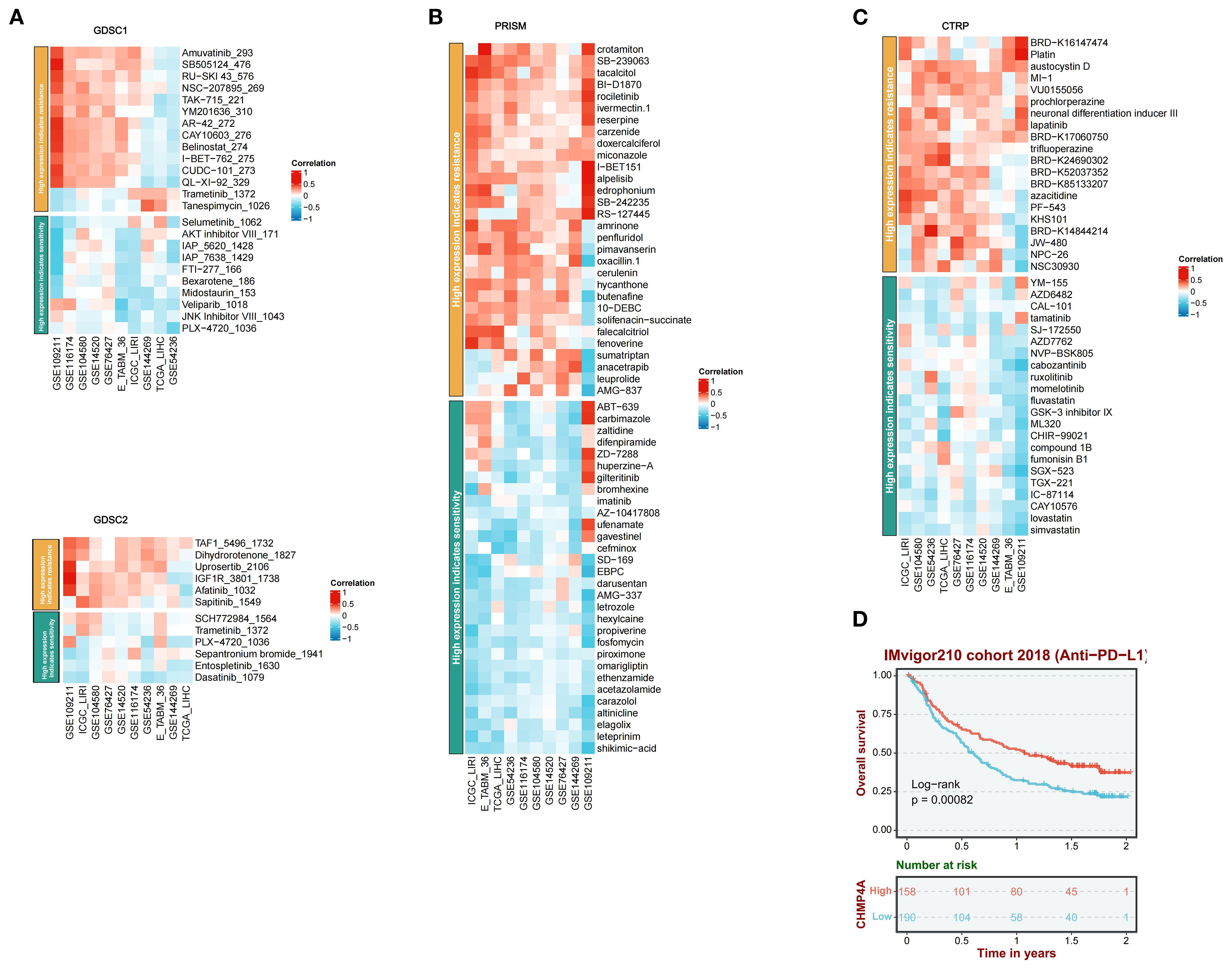 Extensive pharmacological sensitivity data were obtained from three reputable public repositories: the Cancer Therapeutics Response Portal (CTRP v2.0) (https://portals.broadinstitute.org/ctrp.v2.1/), the PRISM Repurposing dataset (https://www.theprismlab.org/), and the Genomics of Drug Sensitivity in Cancer (GDSC) database (https://www.cancerrxgene.org/). To systematically explore the relationship between CHMP4A expression levels and therapeutic response, we utilized Spearman’s correlation analysis to evaluate potential associations with 217 pharmacological agents, including kinase inhibitors, epigenetic modulators, and conventional chemotherapeutic drugs. All bioinformatics analyses were conducted using R statistical software (version 4.3.0), employing the tidyverse ecosystem for data processing, the pRRophetic algorithm for drug response modeling, and ComplexHeatmap for detailed visualization of the results (38).