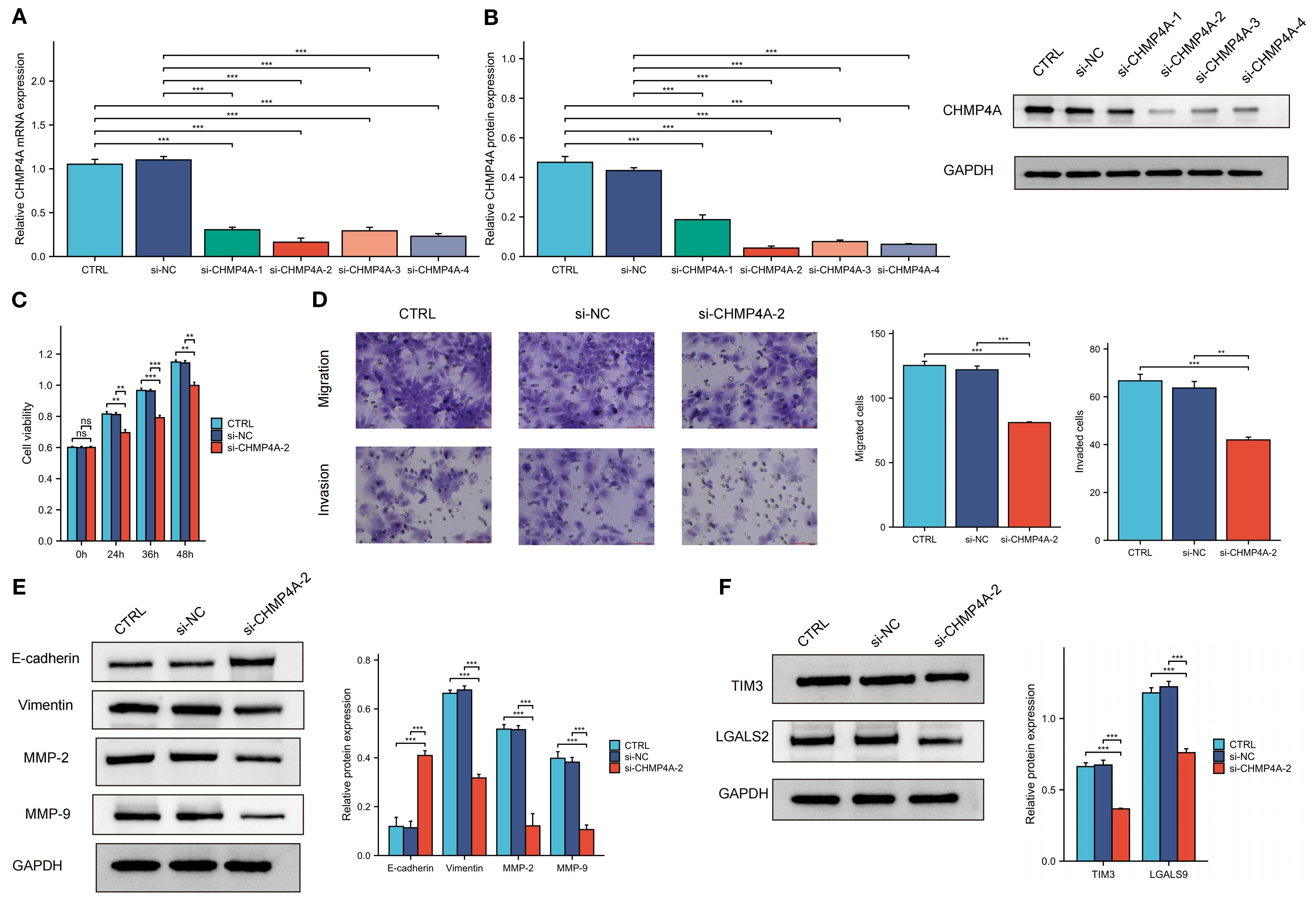 After transfection, cellular samples underwent two washes with phosphate-buffered saline (PBS) and were subsequently lysed using ice-cold RIPA buffer. Protein quantification was conducted utilizing a BCA protein detection kit (GBCBIO, China). Proteins were then separated via electrophoresis on 10% SDS-polyacrylamide gels and transferred to nitrocellulose membranes (Biofroxx, Germany). Membrane blocking was performed with 5% non-fat milk for 2 hours at room temperature, followed by an overnight incubation at 4°C with specific primary antibodies. Between incubations, the membranes were washed three times for 10 minutes each with Tris-buffered saline containing Tween-20 (TBST). Secondary detection was carried out using HRP-conjugated goat anti-mouse IgG (1:10000 dilution, Boster, China), with the same washing conditions applied prior to chemiluminescent development. The immunoblotting analysis included the following primary antibodies: anti-rabbit CHMP4A (1:1000, SinoBiological, China), anti-mouse GAPDH (1:30000, Proteintech, China), anti-rabbit E-cadherin (1:40000, Proteintech, China), anti-mouse Vimentin (1:40000, Proteintech, China), anti-rabbit MMP2 (1:1000, BIOSS, China), anti-rabbit MMP9 (1:1000, Affinity, China), anti-rabbit TIM3(HAVCR2) (1:1000, Boster, China) and anti-rabbit LGALS9 (1:1000, Abmat, China).