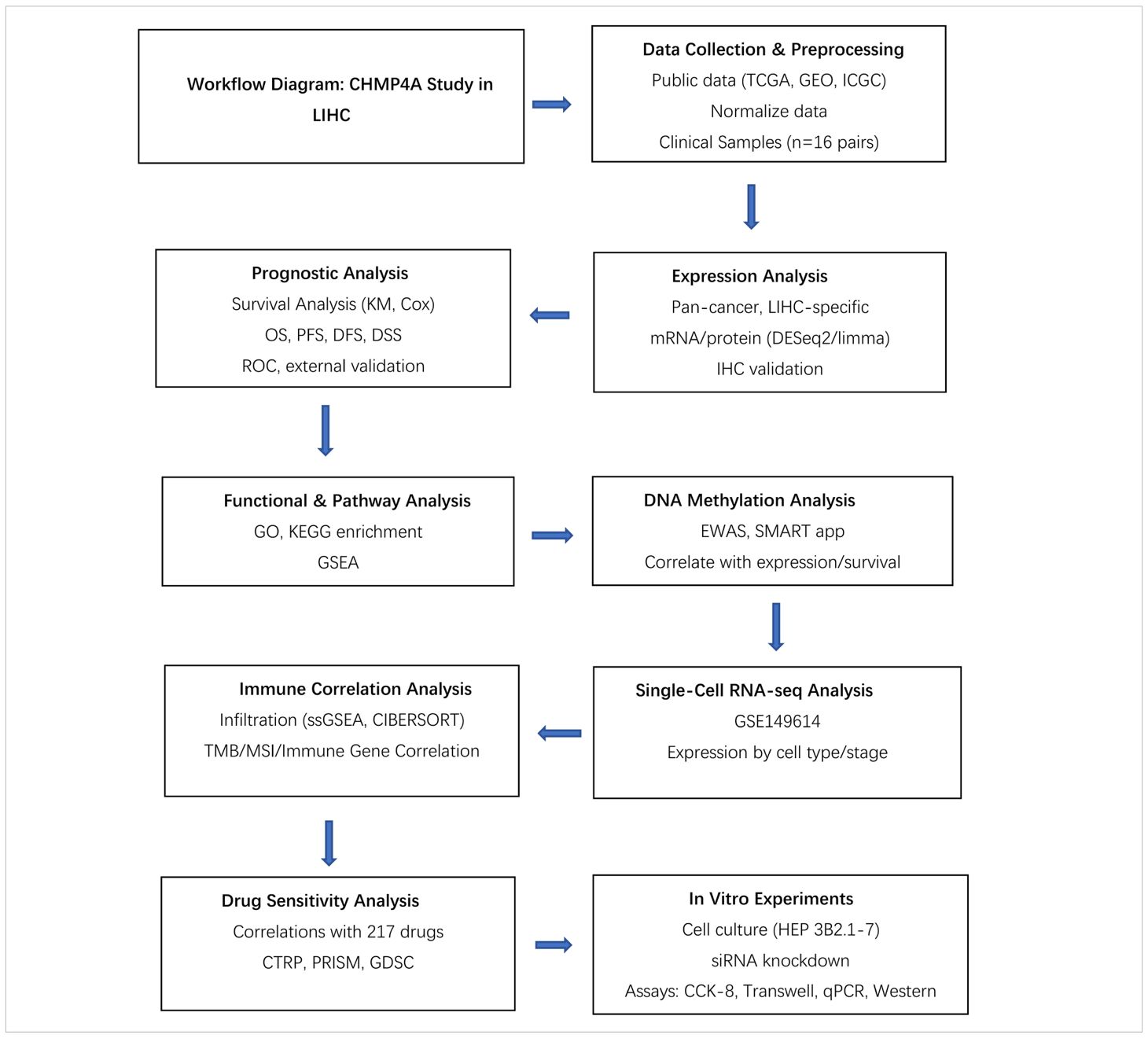 This study analyzed data from TCGA, GEO, and ICGC to explore CHMP4A expression and its prognostic value in LIHC. Immunohistochemistry showed higher CHMP4A levels in LIHC tissues compared to normal samples. DNA methylation, single-cell sequencing, and pharmacological profiling highlighted CHMP4A’s role in LIHC. In vitro assays demonstrated that CHMP4A knockdown reduced LIHC cell proliferation, invasion, and metastasis, affecting EMT markers like E-cadherin, vimentin, MMP-2, and MMP-9. The study also examined CHMP4A’s influence on the tumor immune microenvironment, linking it to TIM3 and LGALS9. Overall, the findings reveal CHMP4A’s crucial role in LIHC development and its therapeutic potential.