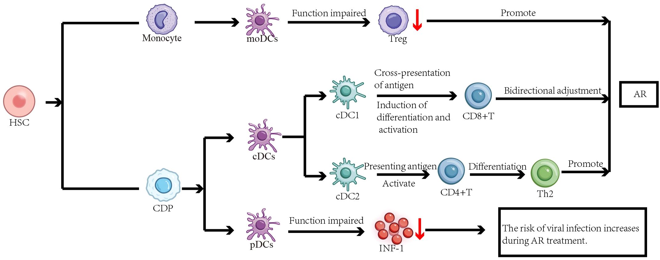 Figure 1. The functions of different dendritic cell subsets and their roles in AR. Both monocytes and common dendritic cell progenitors (CDPs) are derived from hematopoietic stem cells (HSCs). Monocytes can further differentiate into moDCs, while CDPs give rise to cDCs and pDCs.cDC2s present allergens to naive CD4+ T cells, leading to their activation and differentiation into Th2 cells, thereby promoting the development of AR.cDC1s play a dual regulatory role in AR pathogenesis by cross-presenting antigens and inducing the differentiation and activation of CD8+ T cells. When moDCs function is impaired, the number of activated Treg cells decreases, compromising immune tolerance and amplifying the Th2 response, which exacerbates AR. Dysfunctional pDCs produce less IFN-I, which may be associated with an increased risk of viral infection during AR treatment. Together, these DC subsets contribute to immune dysregulation in AR.