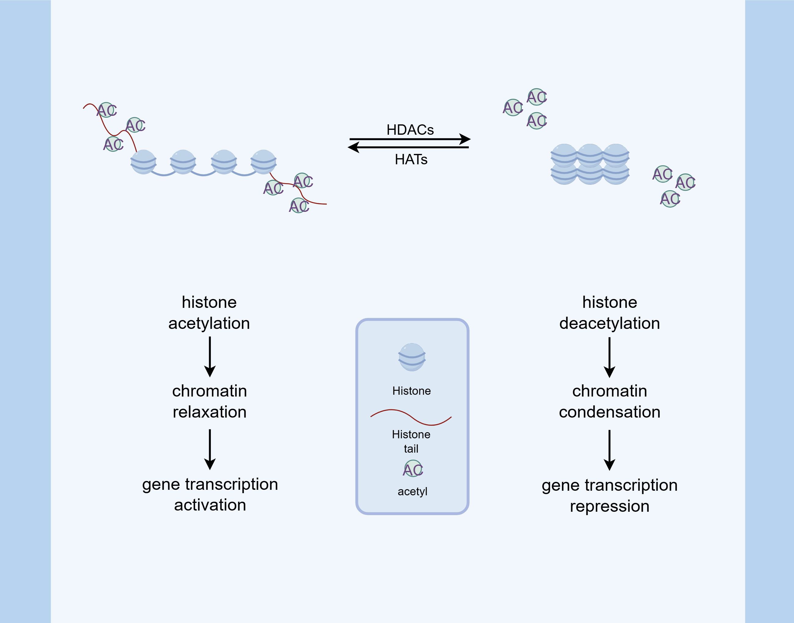Figure 2. Histone acetylation modification. HATs catalyze the addition of acetyl groups to lysine residues on histone tails, which neutralizes the positive charge of histones and weakens their interaction with negatively charged DNA. This process promotes chromatin relaxation and facilitates the binding of transcriptional activators, thereby enhancing gene expression. Conversely, HDACs remove acetyl groups, leading to chromatin condensation and transcriptional repression. The balance between HAT and HDAC activity is critical in modulating inflammatory responses and other cellular processes.