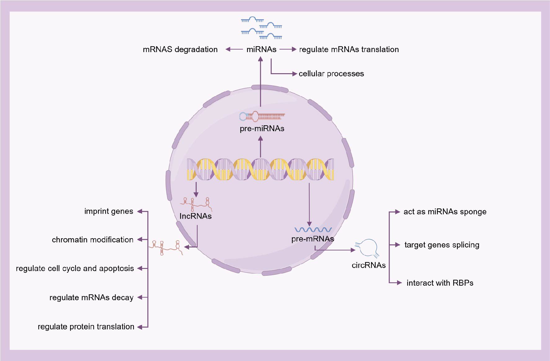 ncRNAs, although not encoding proteins, serve as crucial regulatory molecules in diverse biological processes. On the basis of nucleotide length, ncRNAs are further categorized into long non-coding RNAs (lncRNAs), microRNAs (miRNAs), and circular RNAs (circRNAs). These ncRNAs play a pivotal role in transcriptional regulation, post-transcriptional regulation, and epigenetic regulation (43) (Figure 3).
