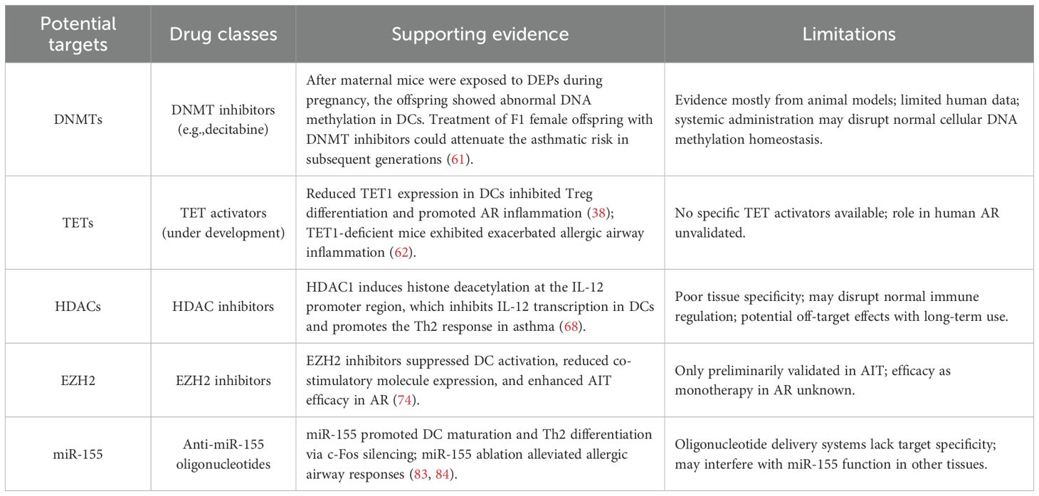 Table 1. Potential epigenetic targets, corresponding drug classes, supporting evidence, and limitations in DCs for AR.