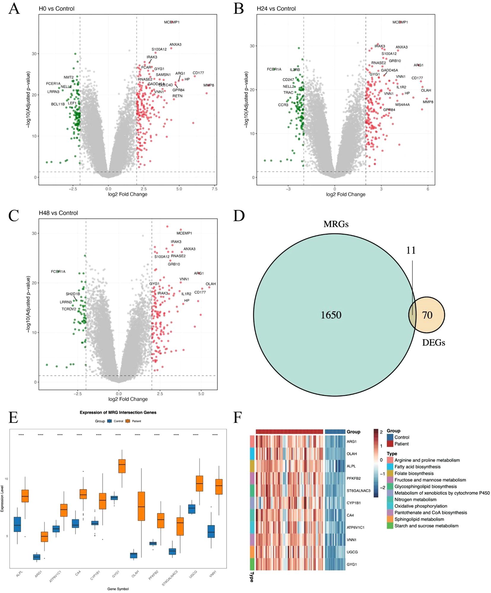 Six-panel image related to gene expression analysis. Panels A, B, and C are volcano plots showing gene expression changes (log2 fold change) between different conditions at H0, H24, and H48 against a control group. Panel D is a Venn diagram showing overlap between MRGs and DEGs. Panel E is a boxplot illustrating expression levels of MRG intersection genes among control and patient groups. Panel F is a heatmap displaying expression of selected genes across different groups, with a color key indicating expression levels and metabolic pathways.