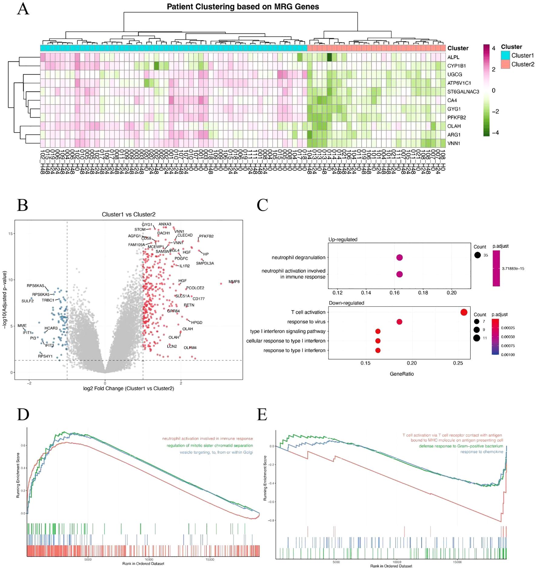Figure 2. Metabolism-related gene expression stratifies sepsis patients into distinct immunological subgroups. (A) Hierarchical clustering of sepsis patients based on metabolism-related gene (MRG) expression, revealing two clusters (Cluster 1 and Cluster 2). (B) Volcano plot showing differentially expressed genes (DEGs) between Cluster 1 and Cluster 2. Red and blue dots represent significantly upregulated and downregulated genes, respectively. (C) GO biological process enrichment analysis of DEGs, showing neutrophil-associated immune responses enriched in Cluster 1. (D, E) Gene Set Enrichment Analysis (GSEA) of hallmark or GO terms between the two clusters. Cluster 1 shows enrichment in neutrophil activation and antibacterial responses (D), while Cluster 2 is associated with T cell-mediated immune pathways (E).