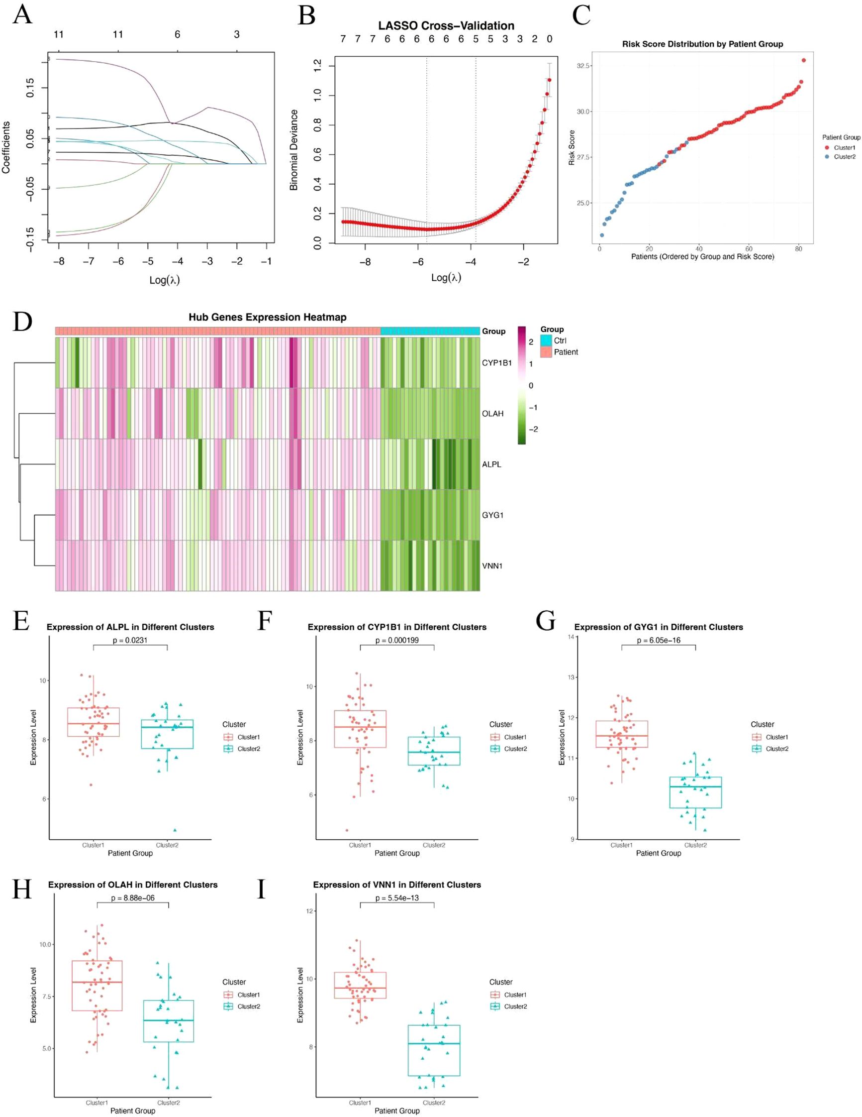 Figure 3. Identification of hub genes and construction of a metabolic risk score model. (A, B) LASSO regression and cross-validation plots based on 11 DEGs between Cluster 1 and Cluster 2. Five hub genes were selected based on the optimal lambda value. (C) Distribution of the calculated risk score across patients from Cluster 1 and Cluster 2, showing higher scores in neutrophil-dominant Cluster 1. (D) Heatmap showing expression patterns of the five hub genes (ALPL, CYP1B1, GYG1, OLAH, VNN1) across all sepsis samples. (E–I) Box plots showing significantly higher expression levels of ALPL (E), CYP1B1 (F), GYG1 (G), OLAH (H), and VNN1 (I) in Cluster 1 compared to Cluster 2. P-values are indicated above each comparison.