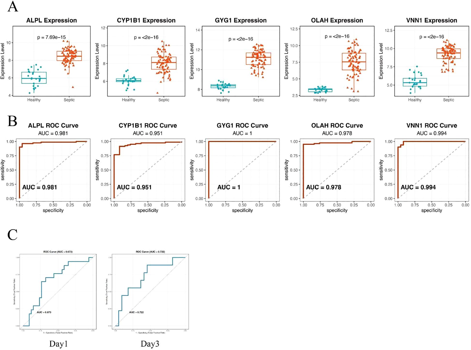 Graphs show gene expression and ROC curves. Panel A: Box plots of ALPL, CYP1B1, GYG1, OLAH, and VNN1 expression levels in healthy and septic subjects. Panel B: ROC curves for ALPL, CYP1B1, GYG1, OLAH, and VNN1, with AUC values of 0.981, 0.951, 1, 0.978, and 0.994 respectively. Panel C: ROC curves for Day 1 and Day 3, with AUC values of 0.697 and 0.732.