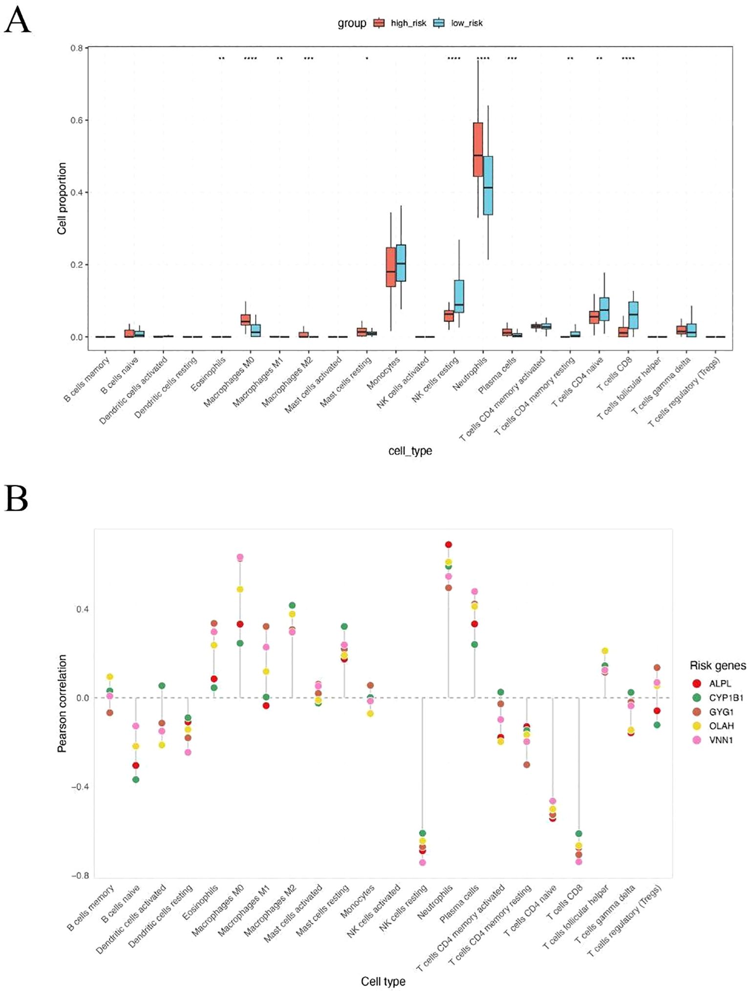 To explore the immunological differences between metabolic subgroups of sepsis, we investigated the immune cell infiltration landscape of high- and low-risk patients defined by our five-gene risk score model. Using the CIBERSORT deconvolution algorithm, we estimated the relative proportions of 22 immune cell types across all patients. Significant differences in immune infiltration were observed between the two groups (Figure 5A). High-risk patients exhibited markedly elevated levels of neutrophils and monocytes, alongside reduced proportions of natural killer (NK) cells and multiple T cell subpopulations, including CD4+ and CD8+ T cells. These findings suggest that high metabolic risk in sepsis is associated with a neutrophil-dominant, lymphocyte-suppressed immune landscape. To further elucidate the immunological relevance of each hub gene, we performed Pearson correlation analysis between gene expression levels and estimated immune cell fractions (Figure 5B). All five risk genes—ALPL, CYP1B1, GYG1, OLAH, and VNN1—showed strong positive correlations with neutrophils, monocytes, and macrophages, and consistent negative correlations with T cells and NK cells. These results suggest that the severity of sepsis may be linked to an imbalance between innate and adaptive immune responses, with high-risk patients exhibiting a shift toward an innate immunity-dominated profile.