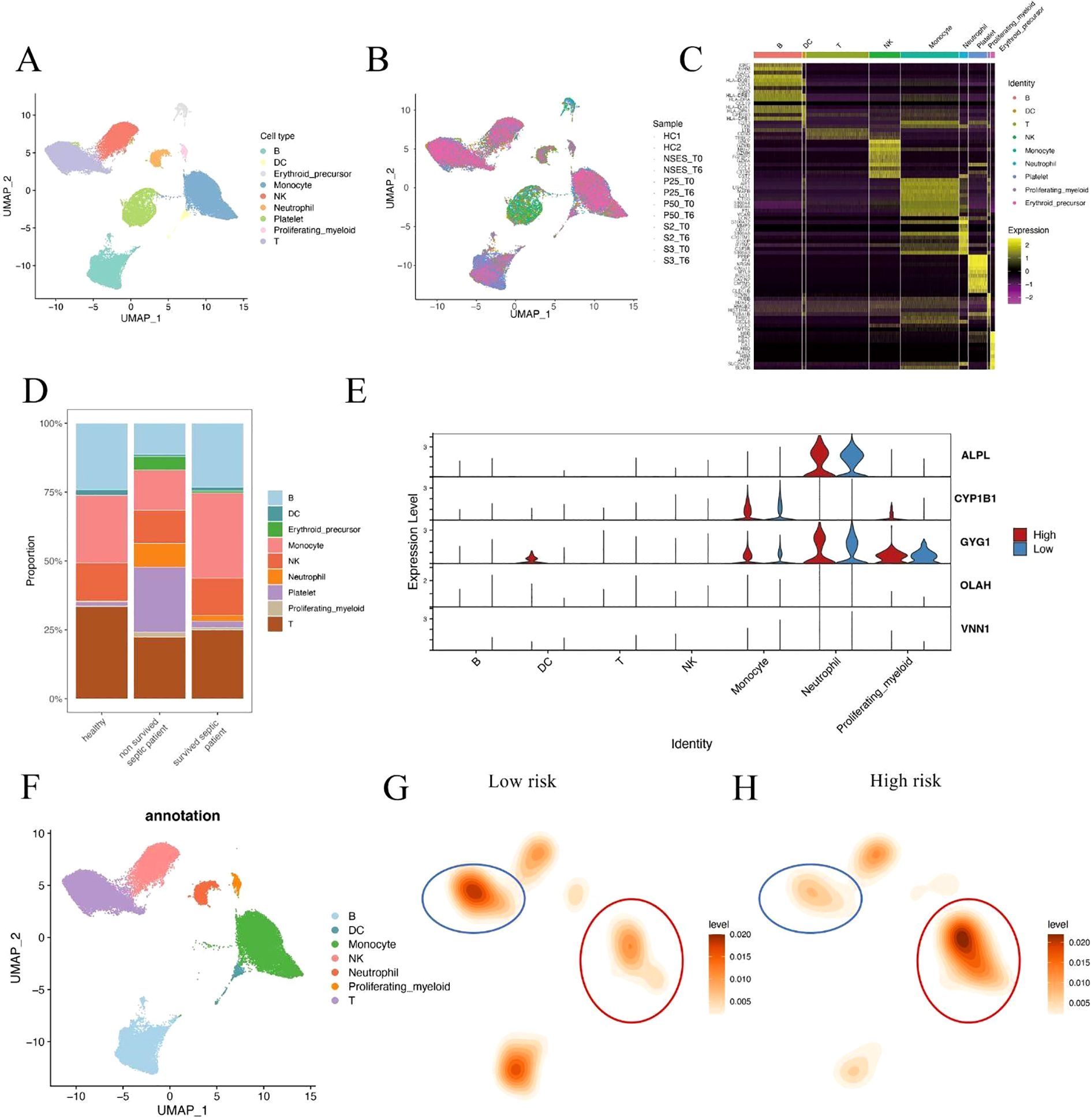 Figure 6. Single-cell analysis of immune cell composition in septic patients. (A, B) UMAP visualization of integrated single-cell RNA-seq data from septic patients and healthy controls. Cells were clustered and annotated based on canonical immune markers. Platelet and erythroid cells were excluded from downstream analysis. (C) Heatmap of representative marker gene expression used for immune cell type annotation. (D) Cell composition comparison across clinical groups shows a significantly increased neutrophil fraction in non-surviving sepsis patients relative to survivors and healthy controls. (E) Violin plots showing expression of hub genes (ALPL, CYP1B1, GYG1, OLAH, VNN1) across immune cell subsets in high- and low-risk patients. Three genes were enriched in innate immune cells, while two showed minimal expression in immune lineages. (F) UMAP plot showing immune cell type annotations used in downstream comparison. (G, H) Density maps illustrating differences in immune cell distributions between low-risk (G) and high-risk (H) patients. Monocytes were expanded in high-risk patients, while T cell density was reduced.