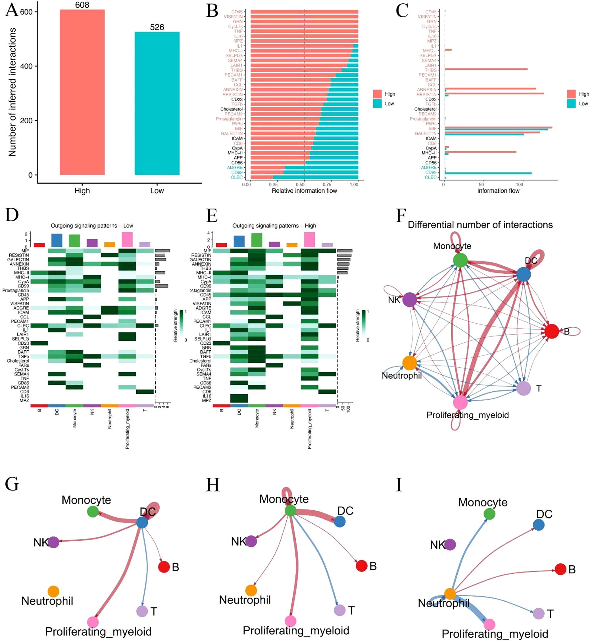A multi-part scientific figure comparing cell interactions and signaling patterns across different conditions. Panel A shows a bar graph of inferred interactions for high (608) and low (526) conditions. Panel B displays a relative information flow bar chart, contrasting high and low interactions. Panel C presents information flow data using bar graphs for each condition. Panels D and E provide heatmaps of outgoing signaling patterns for low and high groups, respectively, including various genes. Panels F, G, H, and I illustrate interaction networks among monocytes, dendritic cells, neutrophils, and other cells, differentiating conditions and showing directional links.