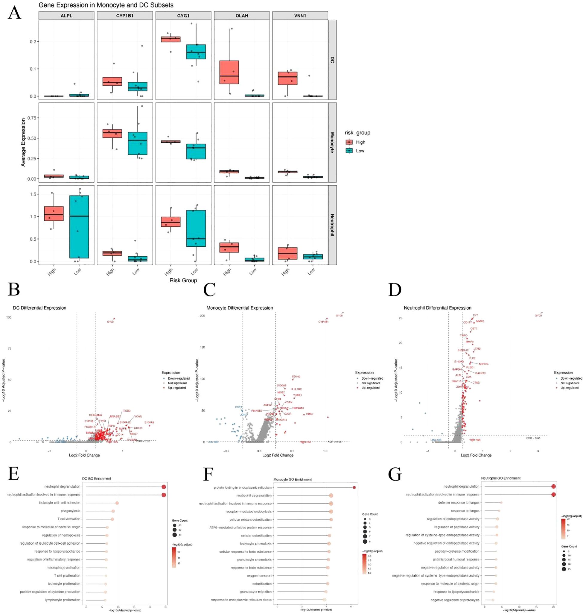 Chart A displays box plots comparing gene expression in monocyte and dendritic cell subsets across high and low-risk groups. Charts B, C, and D are volcano plots showing differential expression in dendritic cells, monocytes, and neutrophils, respectively. Charts E, F, and G display gene ontology enrichment with bar graphs for dendritic cells, monocytes, and neutrophils, highlighting significant pathways.