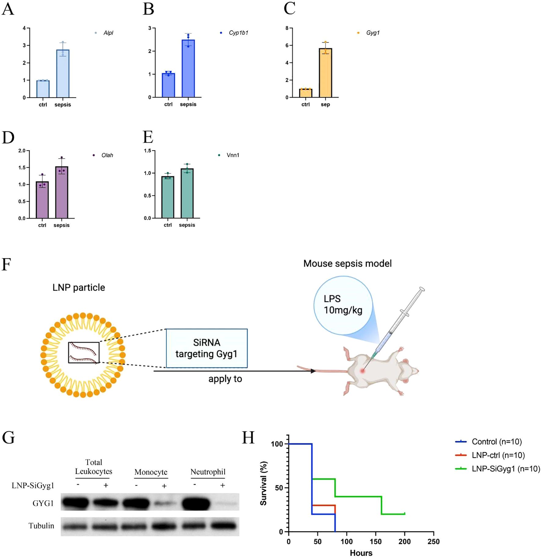 To validate the in vivo relevance of the hub genes identified in our computational analyses, we first measured their expression in peripheral blood from an LPS-induced sepsis mouse model using qPCR. Among the five hub genes (Alpl, Cyp1b1, Gyg1, Olah, Vnn1), all except Olah and Vnn1 were significantly upregulated in septic mice compared to controls, with Gyg1 showing the most pronounced increase (Figures 9A–E). Given the strong predictive performance of Gyg1 and its association with pro-inflammatory innate immune programs, we next investigated whether targeting Gyg1 could ameliorate sepsis outcomes. We formulated lipid nanoparticles (LNPs) encapsulating siRNA specific to Gyg1 (LNP-SiGyg1) and administered them intravenously 24 hours prior to LPS injection (10 mg/kg) and at 24-hour intervals thereafter (Figure 9F). To confirm the cellular specificity and efficiency of LNP–siGyg1 delivery, we evaluated GYG1 protein expression in distinct peripheral immune subsets. Western blot analysis demonstrated a marked reduction of GYG1 protein in both monocytes and neutrophils following LNP–siGyg1 treatment, whereas total leukocytes also exhibited an overall decrease, confirming effective knockdown of Gyg1 in circulating myeloid cells (Figure 9G). Kaplan–Meier survival analysis revealed that Gyg1 silencing markedly improved survival compared to both untreated and LNP-control siRNA-treated groups (Figure 9H), suggesting that metabolic targeting of Gyg1 may offer therapeutic benefit in sepsis.