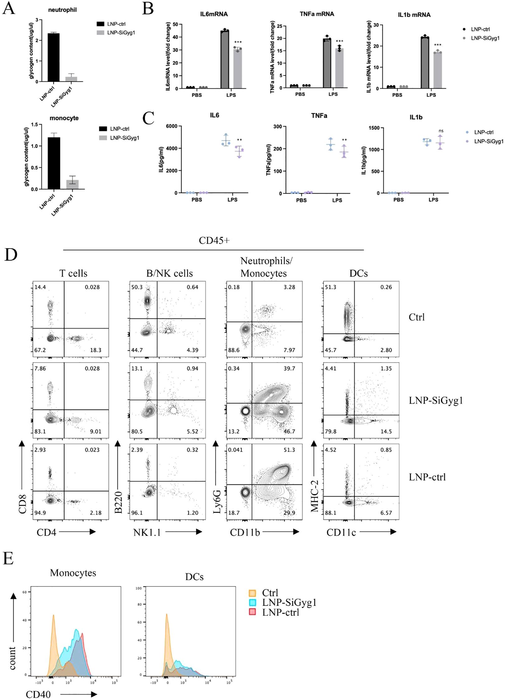 Graphs and flow cytometry plots illustrating immune cell data:   A) Neutrophil and monocyte glycogen content comparison between LNP-ctrl and LNP-SiGyg1.   B) Expression levels of IL6, TNFα, and IL1b mRNA in PBS and LPS conditions for LNP-ctrl and LNP-SiGyg1.   C) Concentrations of IL6, TNFα, and IL1b cytokines in PBS and LPS conditions.   D) Flow cytometry plots of CD45+ immune cells, showing T cells, B/NK cells, neutrophils/monocytes, and dendritic cells across different treatments (Ctrl, LNP-SiGyg1, LNP-ctrl).   E) CD40 expression on monocytes and dendritic cells represented by colored histograms for each treatment group.