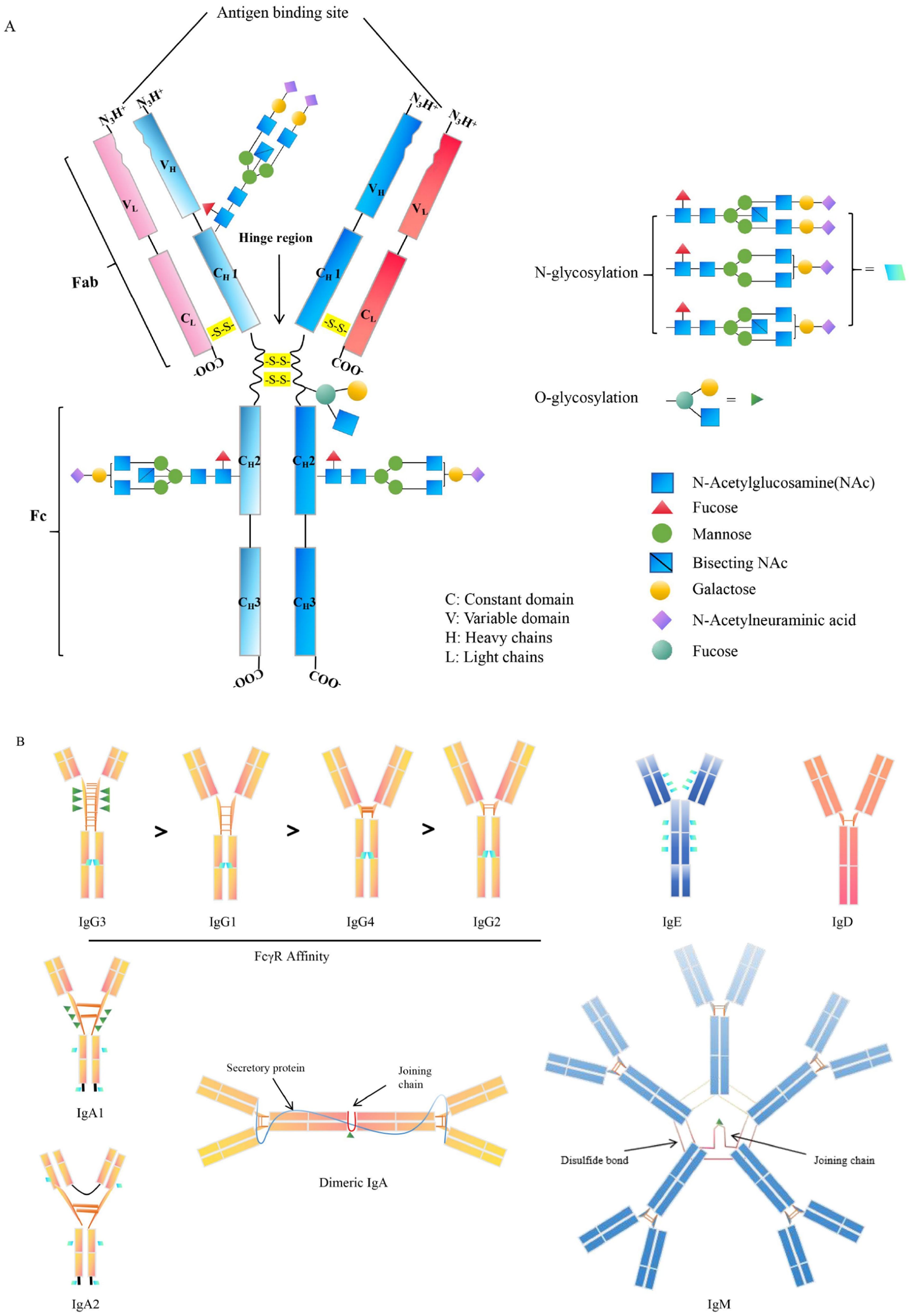 Figure 1. Structure of antibodies’ isotypes and subclasses. (A). The general structure of antibody. The variable glycosylated chains are distributed in different antibody fractions such as the Fab and Fc domain. (B). The structure and characteristics of antibody isotypes. The IgG is classed into 4 subclasses, including IgG1, IgG2, IgG3, and IgG4, according to the variations in heavy and light chain disulfide bonds. IgG subclass identified by FcγR affinity. In particular, IgG and IgE are only present as monomers, while the IgA exists either as monomers, such as IgA1 and IgA2 or as dimers. Additionally, IgM is solely presented as multimers, primarily as pentameric structures. N-glycosylation sites: ; O-glycosylation sites.